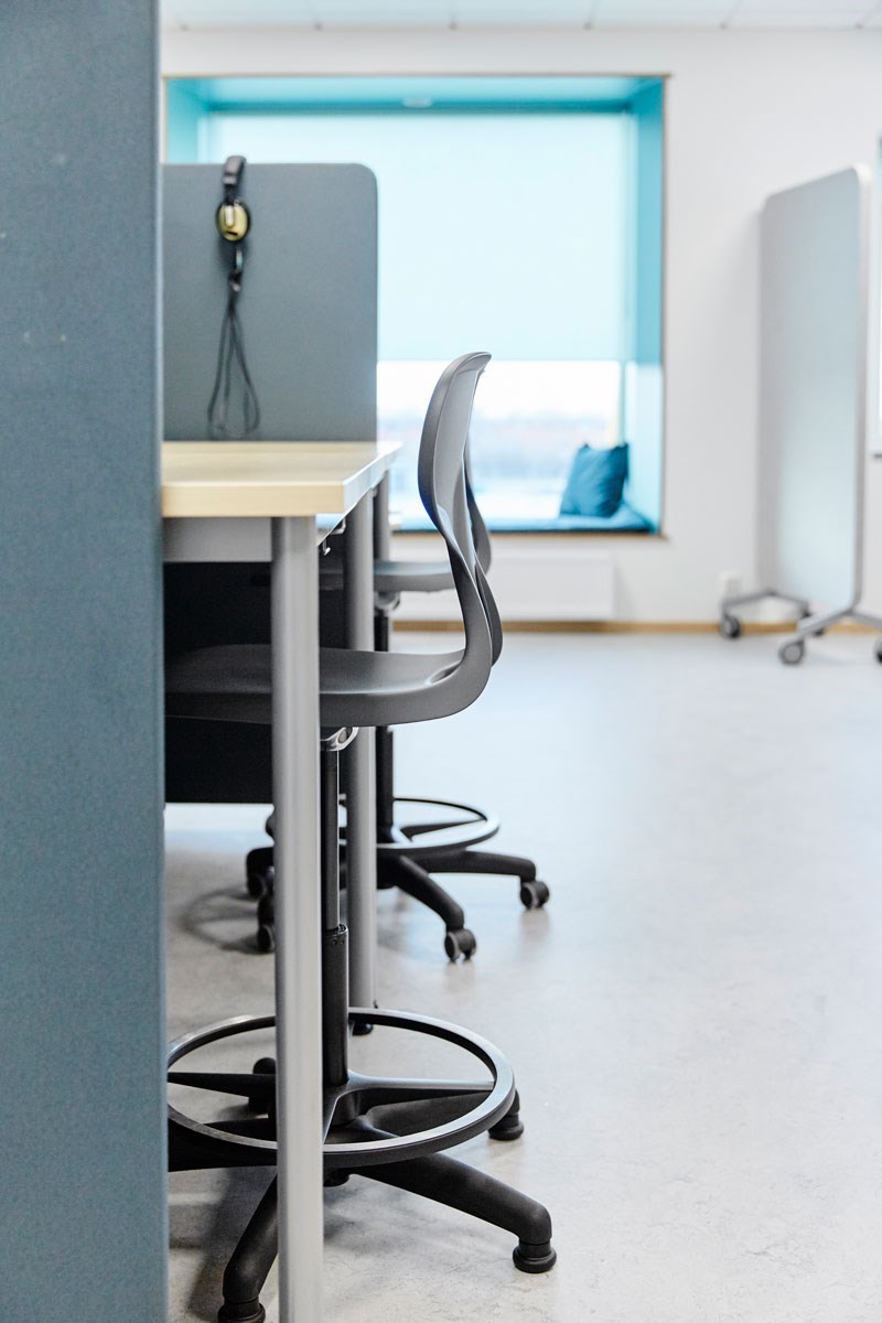 Med lydabsorbenten Enkel kan man enkelt dele opp rommet eller skape avskilte og lyddempede områder som raskt kan tilpasses etter behov. Elevstolen Poly tilbyr utmerket ergonomi og er justerbar i høyden med en brukervennlig gasspatron.
