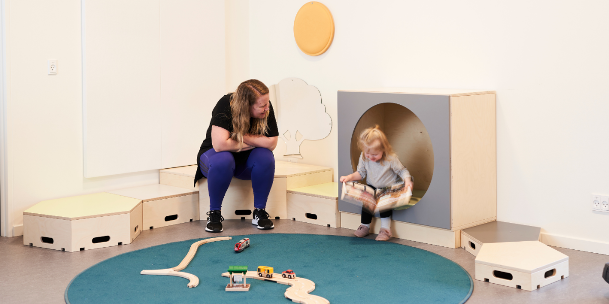 Gangarealene mellom rommene er også aktivt tatt i bruk som leke- og aktivitetsområder, med temaene Landsvei og Sti. Dette gir barna mulighet til å utforske og bevege seg fritt i et miljø som inviterer til lek, læring og samspill – både inne i avdelingene og i overgangssonene mellom dem.