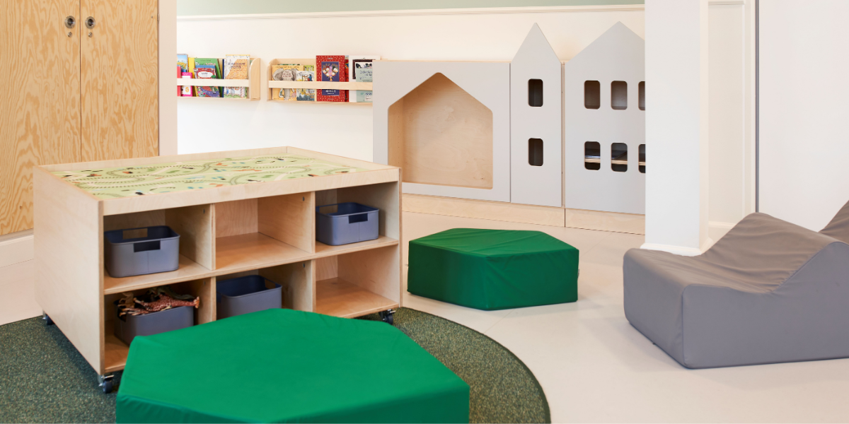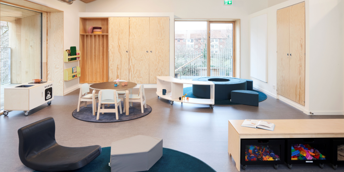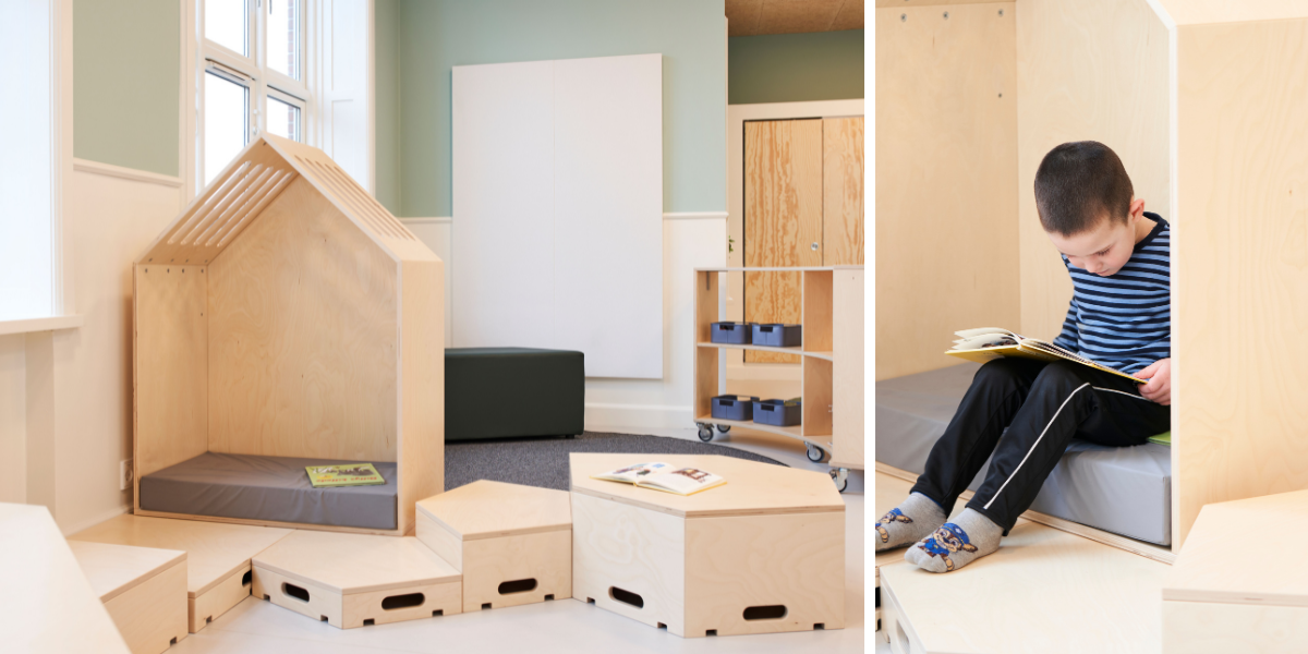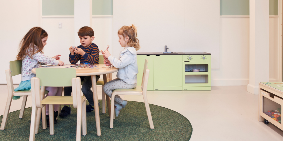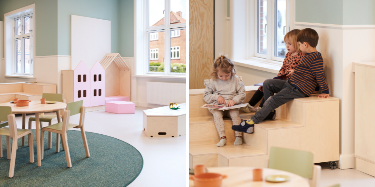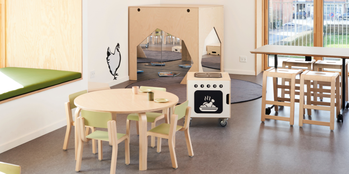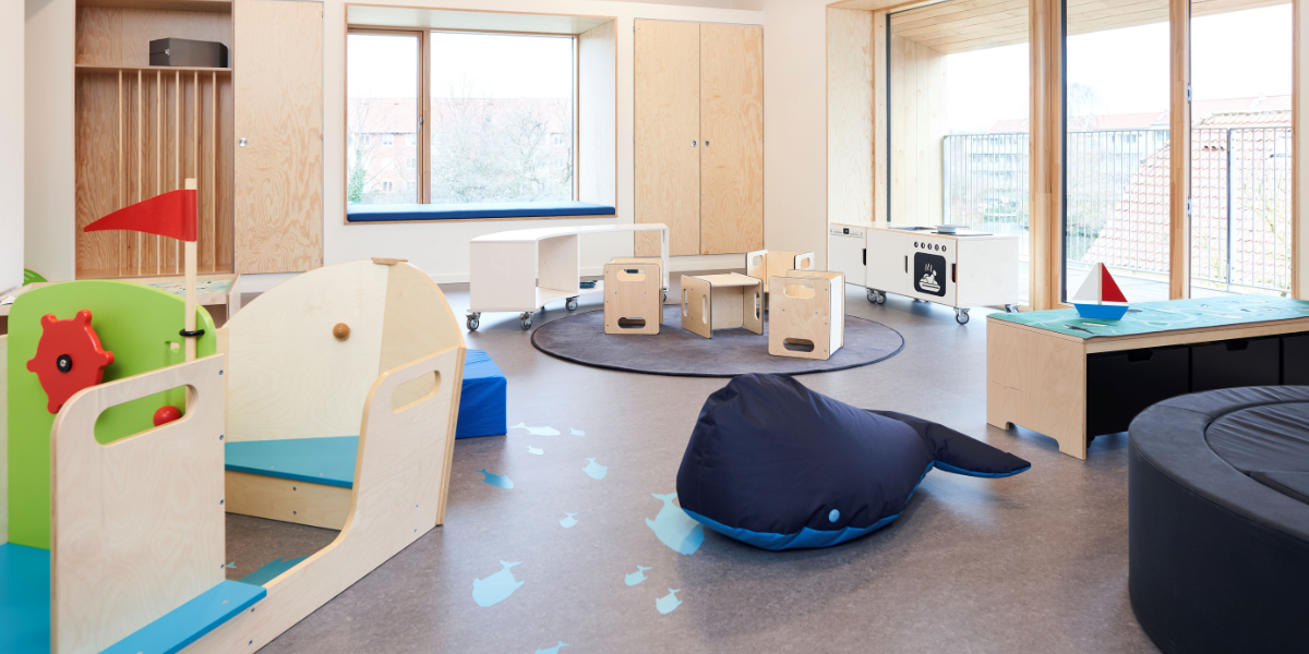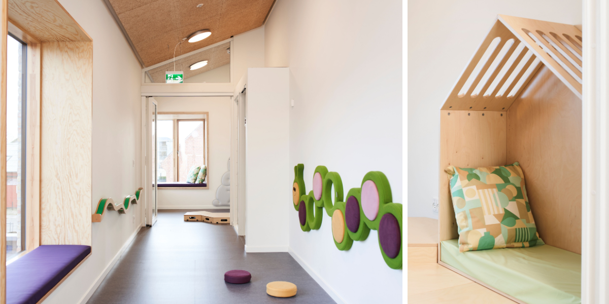 Alle oppholdsrom er organisert i tydelige lekesoner som legger til rette for samling, lærerik lek, rollelek i ulike former, samt refleksjon og fordypning. De varierende romtemaene har åpnet for et bredt og variert utvalg av møbler i både oppholdsrom og fellesområder – med farger, former og materialer som understøtter temaene og inviterer til ulike typer lek.