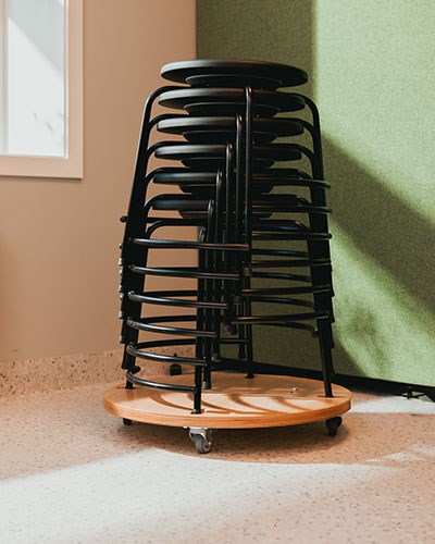 Musikkrommet er innredet med fokus på både funksjon og formidling. Her handler det ikke bare om å spille musikk, men om å skape et rom som fremmer kreativitet, rytme og fellesskap. Multi-krakker gir bevegelsesfrihet og komfort, viktig når elevene jobber praktisk med lyd, rytme og instrumenter.