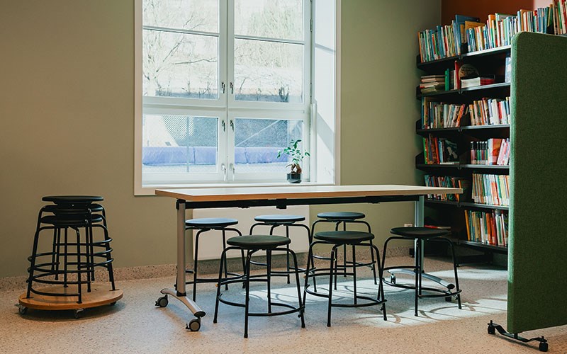 For sitteplasser har vi valgt Krakk Multi PUR med svart stativ og en sittehøyde på 46 cm. Disse krakkene er komfortable og slitesterke, ideelle for et aktivt biblioteksmiljø. Krakkene kan stables, noe som gjør det enkelt å rydde og tilpasse rommet til ulike aktiviteter.