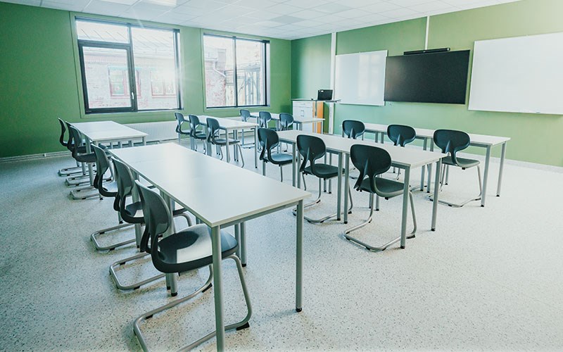 Klasserommene er utstyrt med Bord 12:38, kjent for sin holdbarhet og fleksibilitet. Bordene i størrelsen 70x60 cm kan lett ommøbleres etter behov, fra individuelt arbeid til gruppearbeid. Bordene er laget av FSC-sertifisert materiale, som sikrer bærekraftig bruk av ressurser.