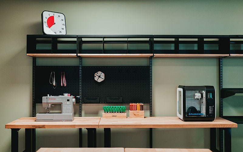 Makerspace-rommet er innredet med fokus på funksjonalitet og fleksibilitet. Rommet inspirerer til kreativitet og samarbeid blant elevene, samtidig som det gir praktiske løsninger for oppbevaring og ulike arbeidssoner.