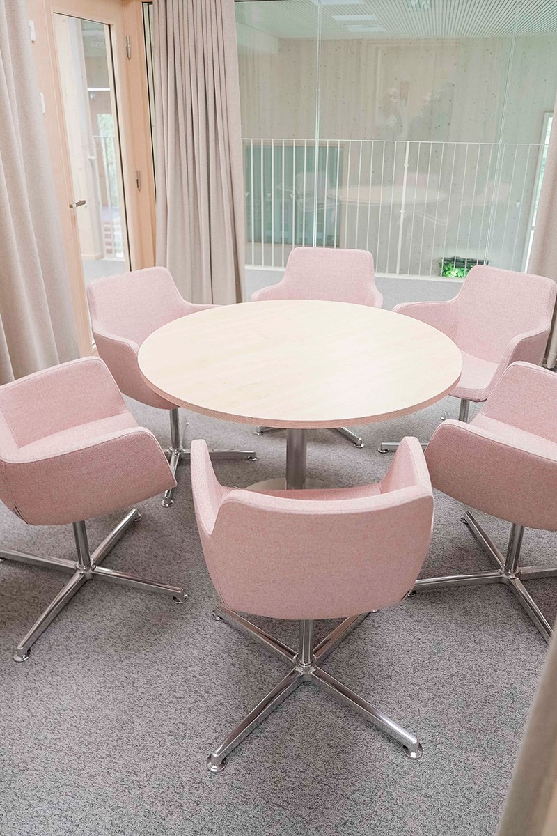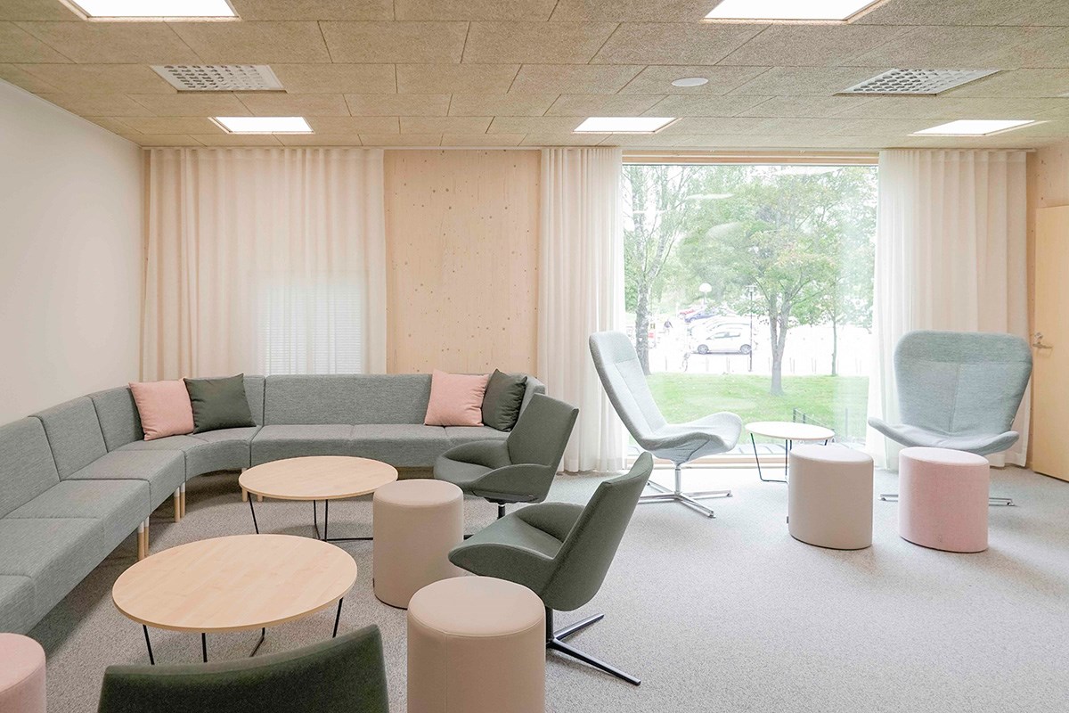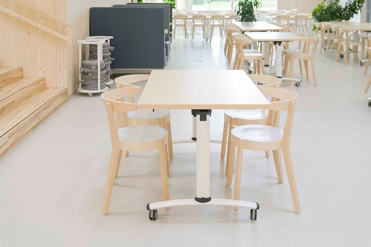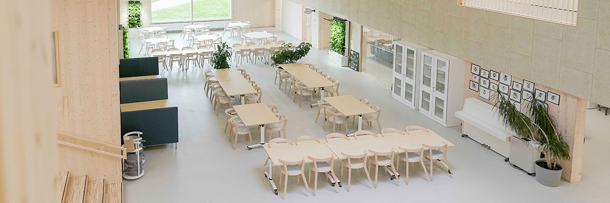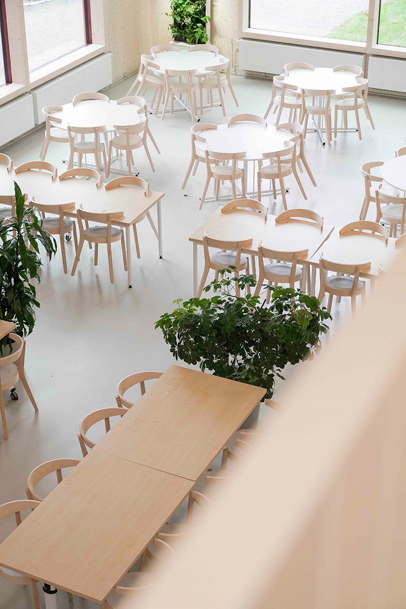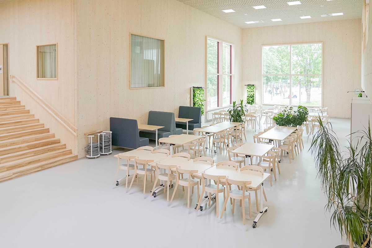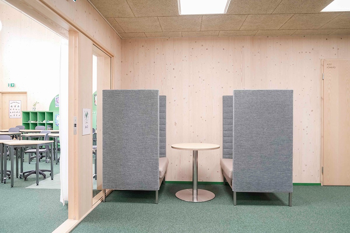 Den vakre trebygningen har møbler som er nøye koordinert med materialene og den harmoniske fargepaletten. Det er lagt spesiell vekt på fleksibilitet og tilpasningsevne i skolens daglige bruk. Utenfor klasserommene er det skapt innbydende rom for møter og effektivt gruppearbeid gjennom smart møblering.