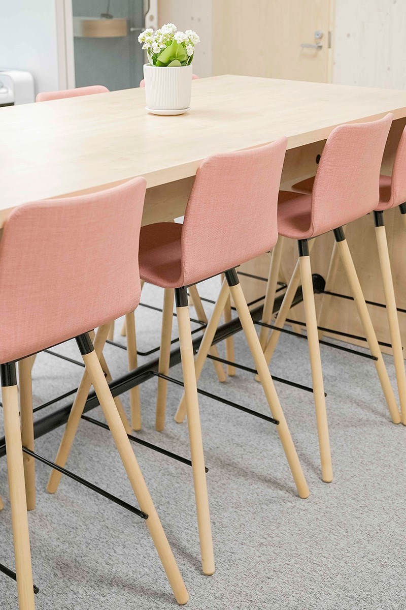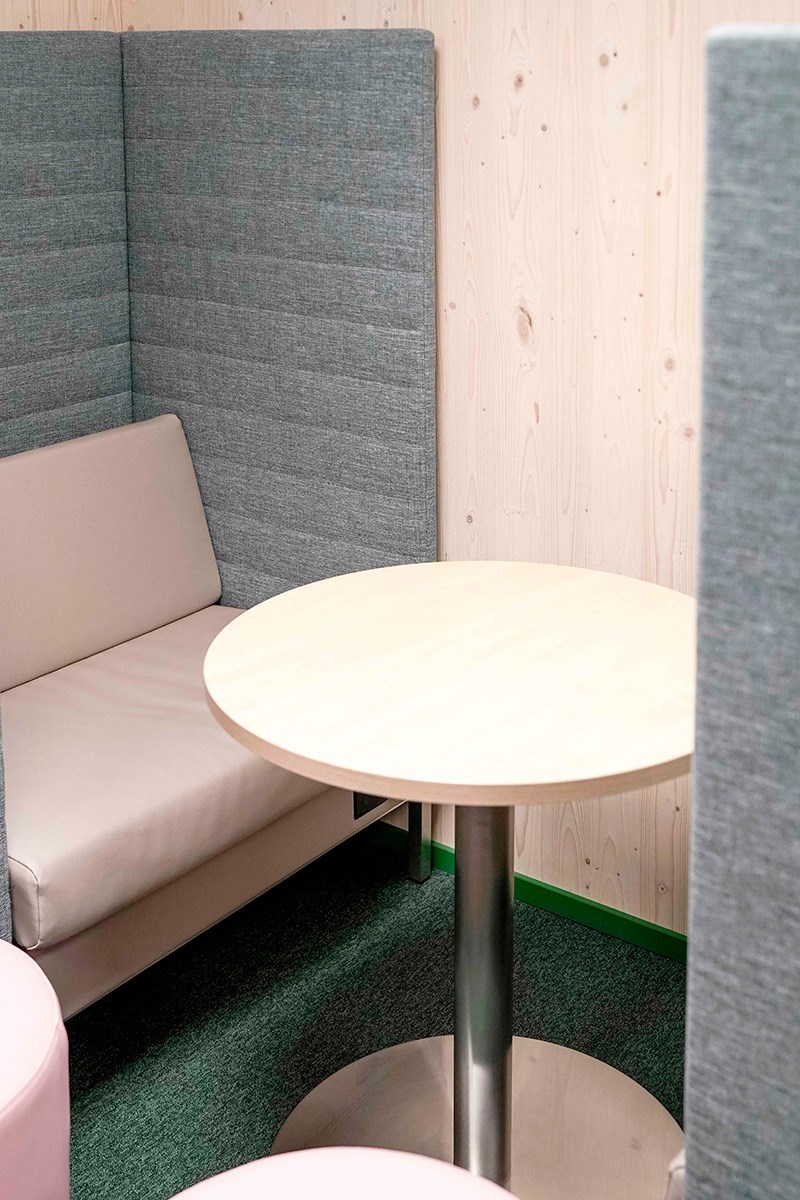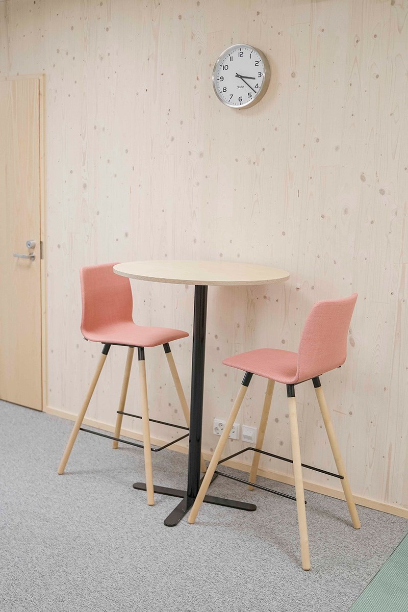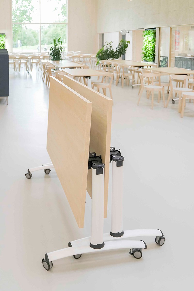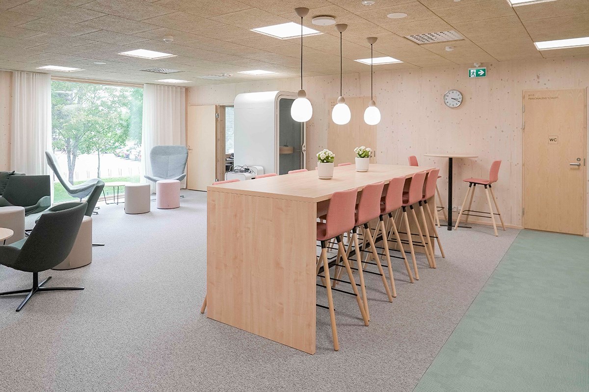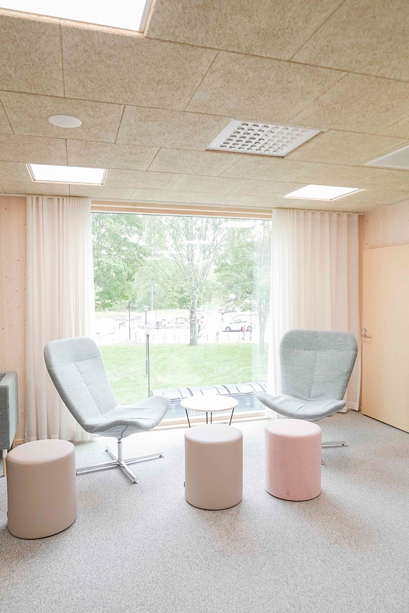 Den vakre trebygningen har møbler som er nøye koordinert med materialene og den harmoniske fargepaletten. Det er lagt spesiell vekt på fleksibilitet og tilpasningsevne i skolens daglige bruk. Utenfor klasserommene er det skapt innbydende rom for møter og effektivt gruppearbeid gjennom smart møblering.