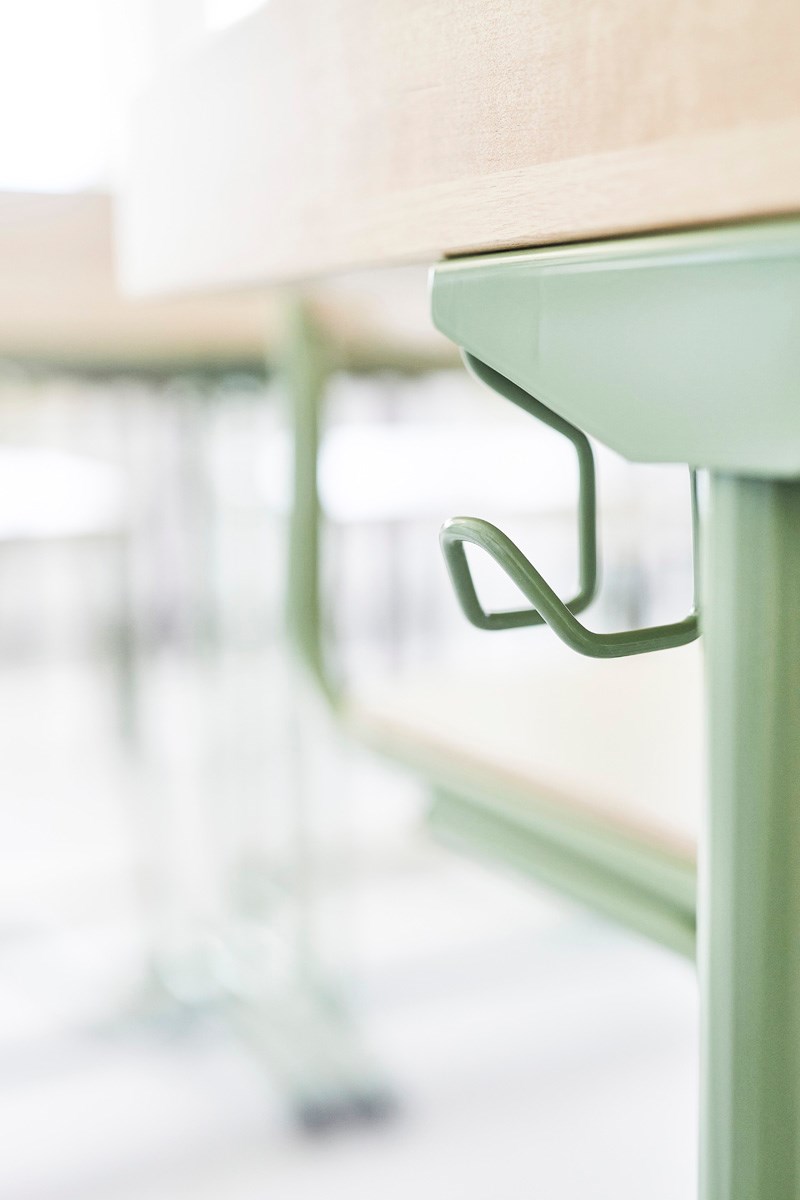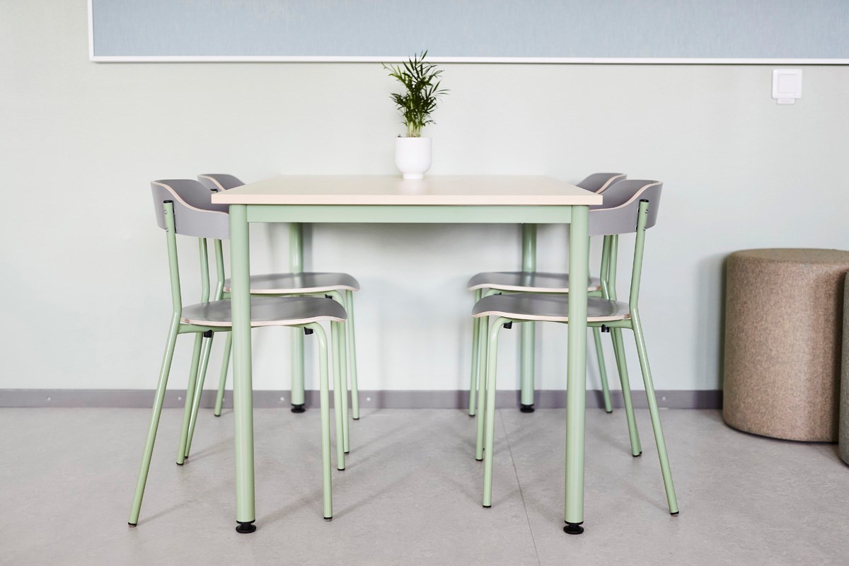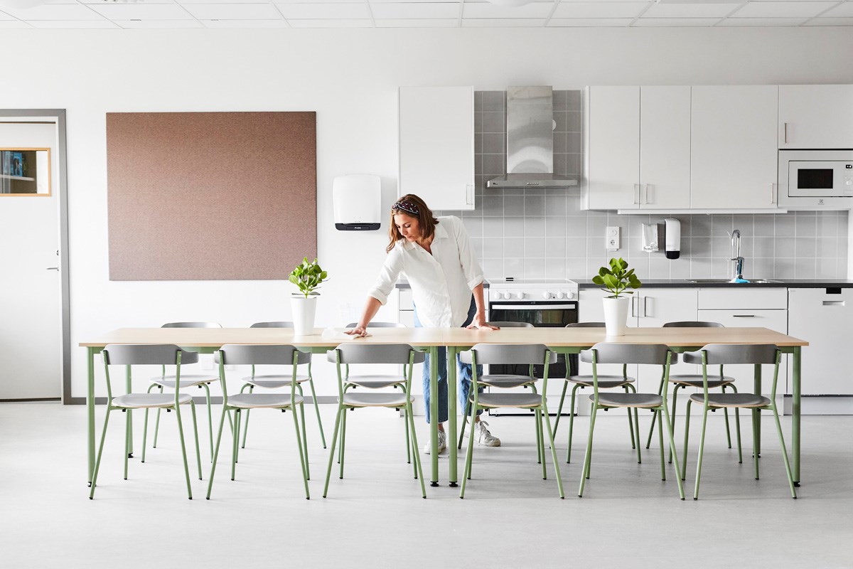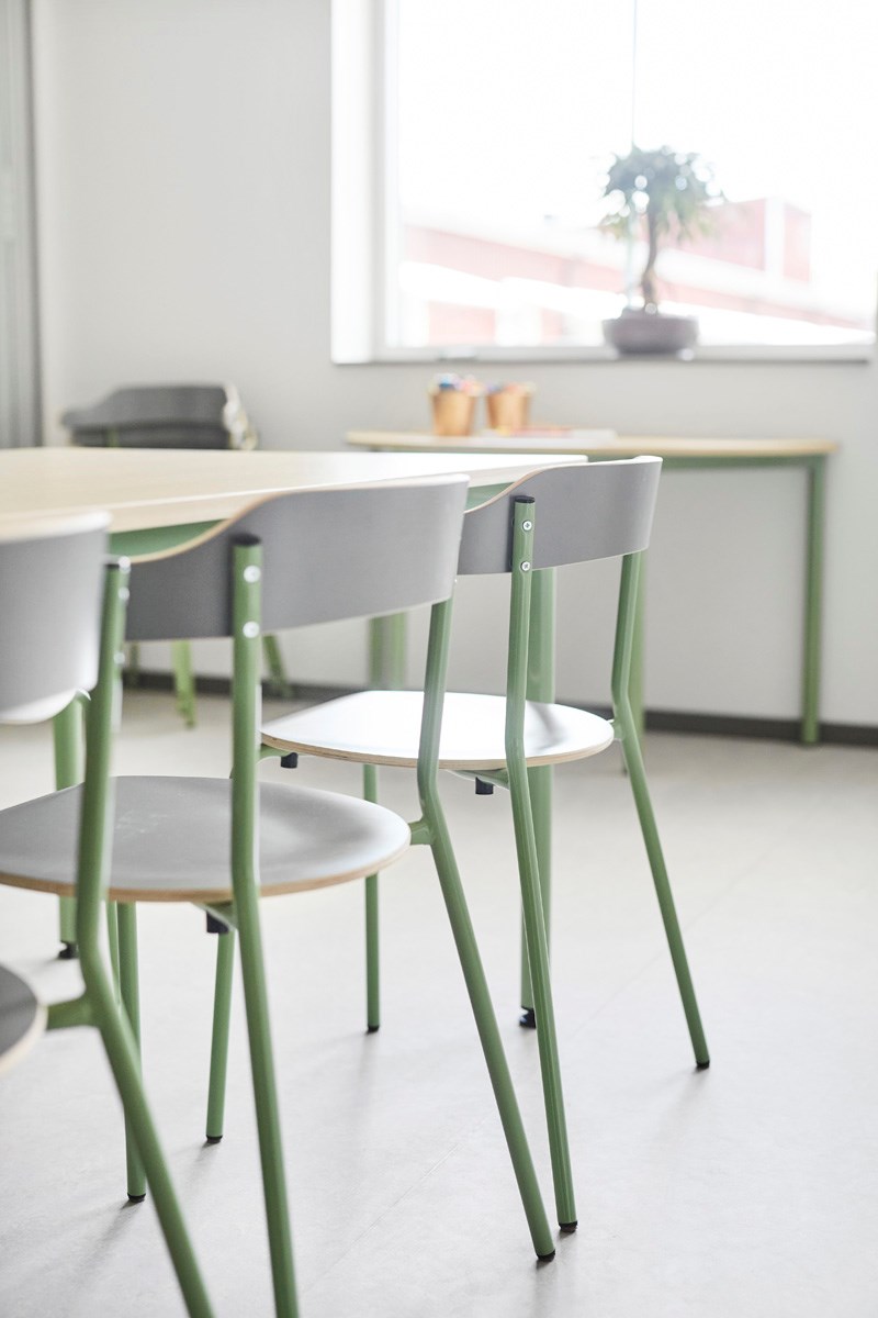 Skolekjøkkenet er møblert med et lydabsorberende elevbord 12:38 og den praktiske stabelbare Jessy-elevstolen i metall.