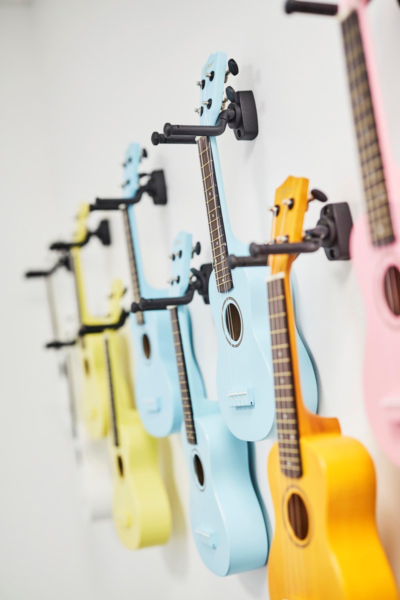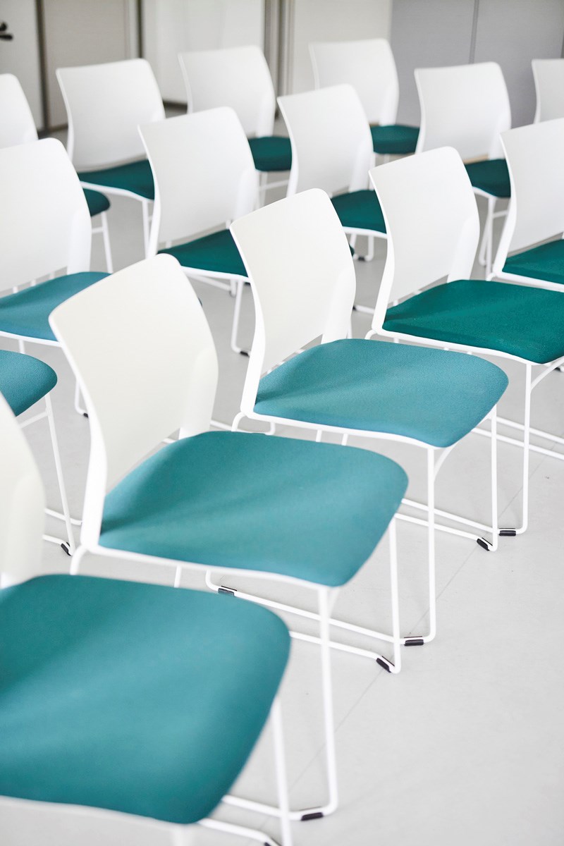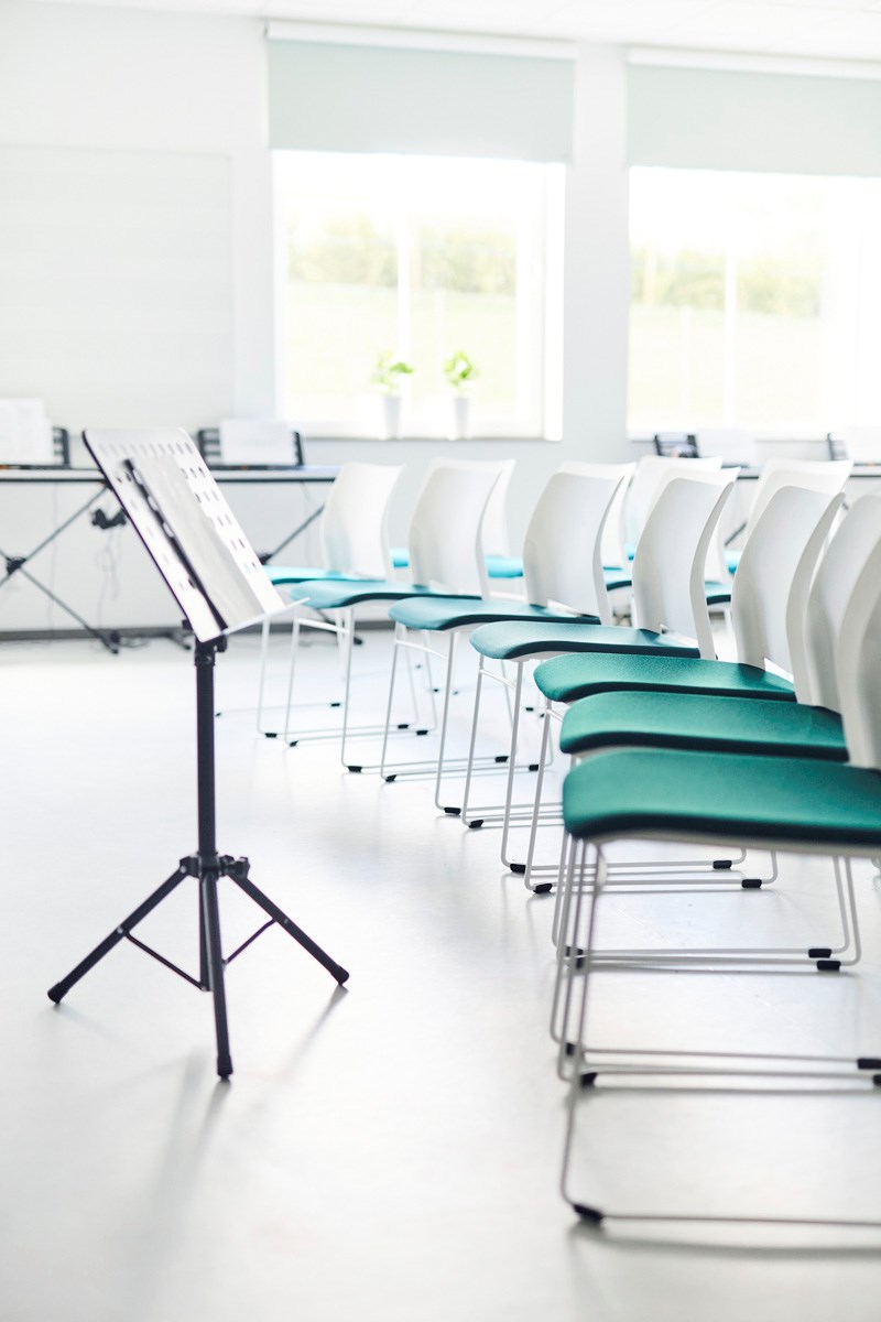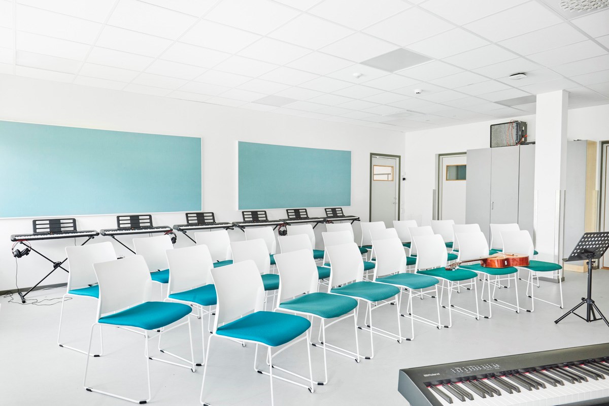 Musikkrommet er møblert med en praktisk stabelbar stol som enkelt kan flyttes rundt og tilpasses ulike læringssituasjoner. Stolene har polstrede seter i 3 forskjellige farger, noe som gir musikksalen et varmt og livlig inntrykk.