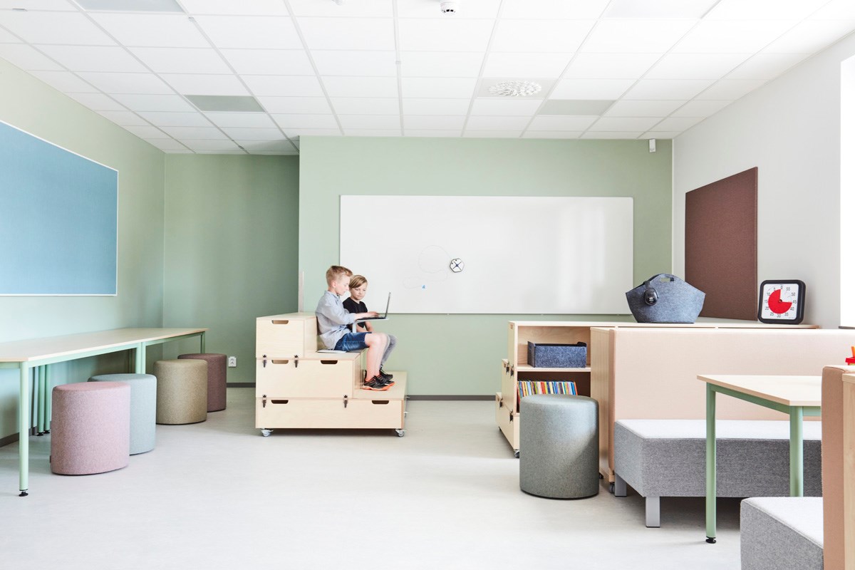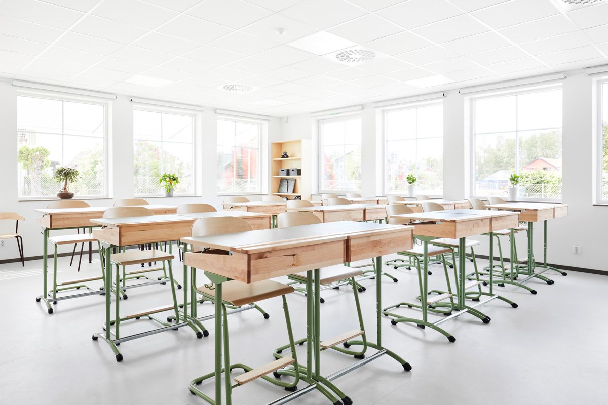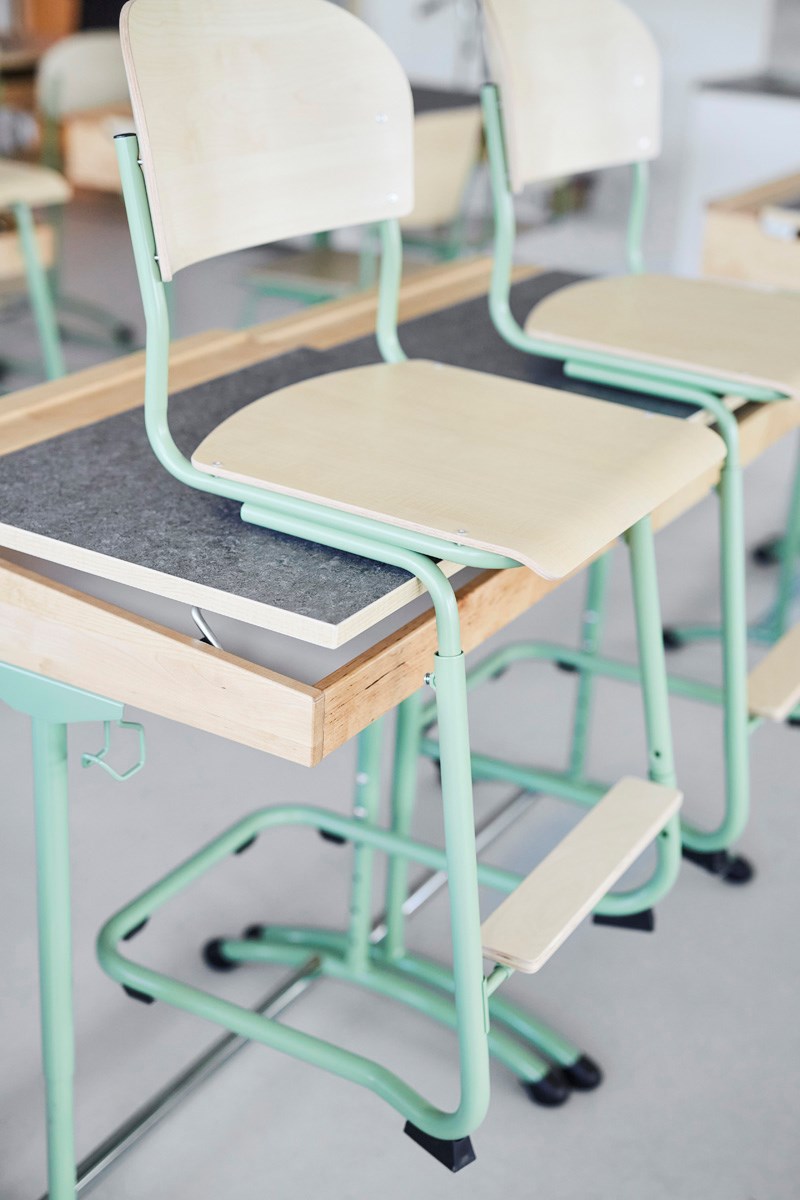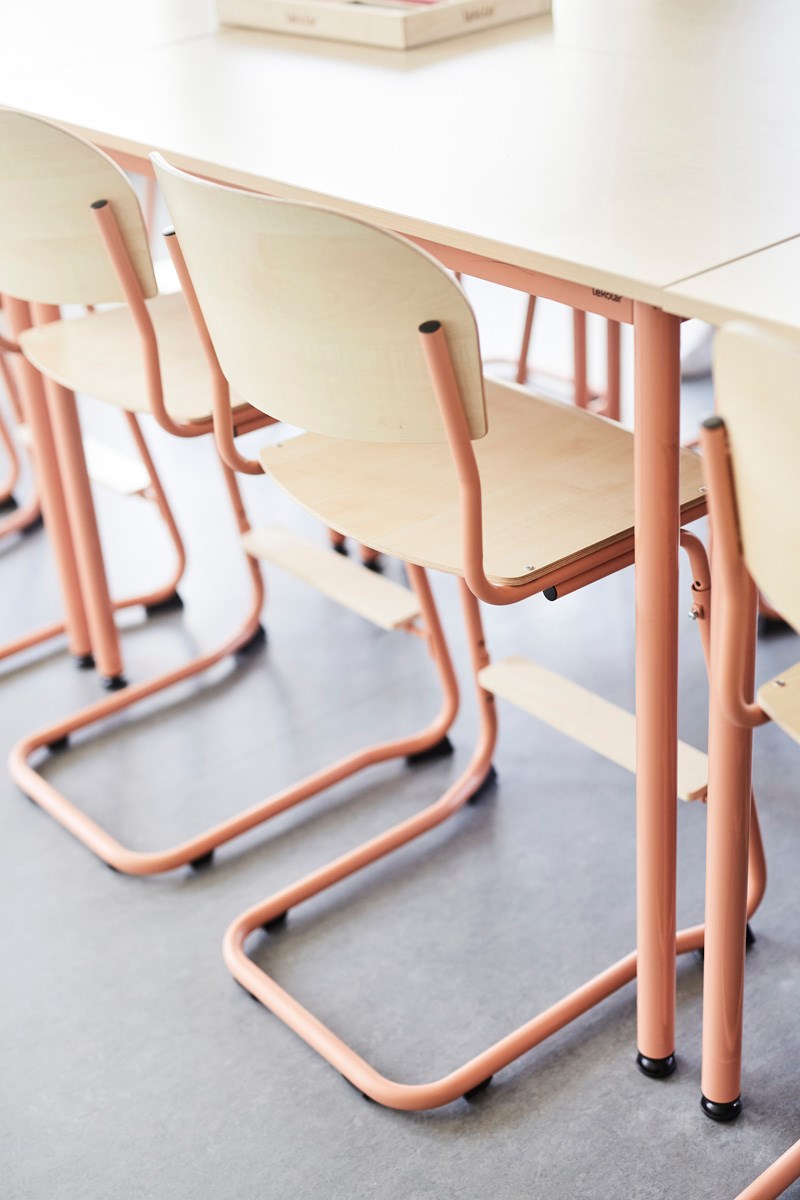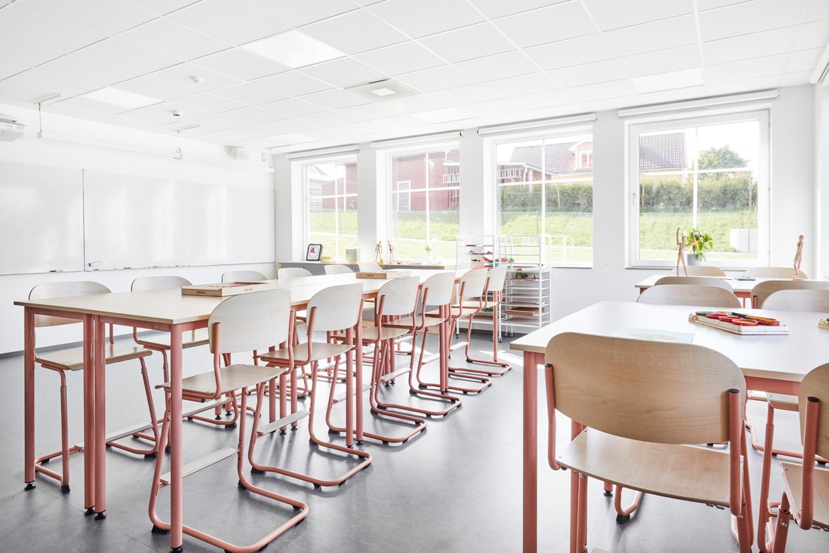 Klasserommene er møblert med et individuelt sete for hver elev, og møblene som er valgt er Matte-elevstolen og Mandal-skolepulten med innebygd oppbevaring.