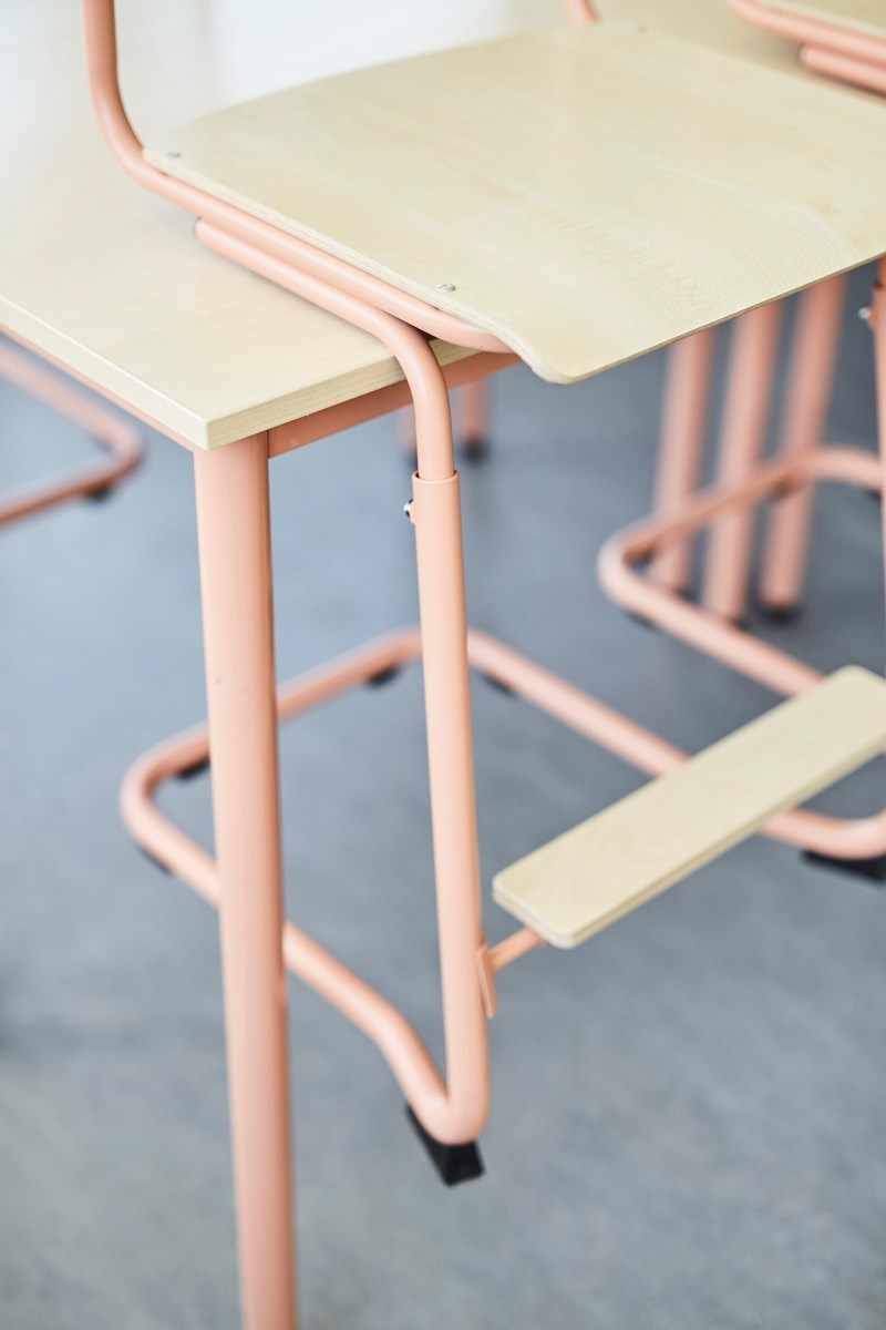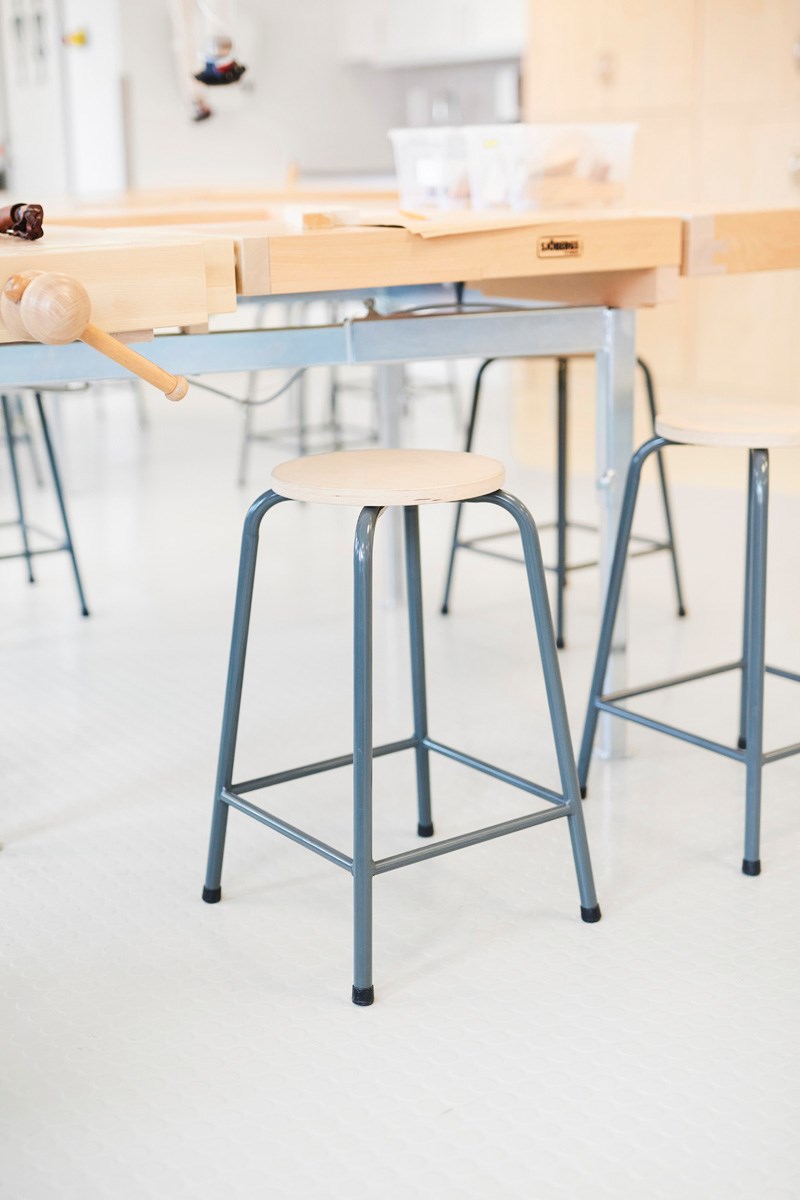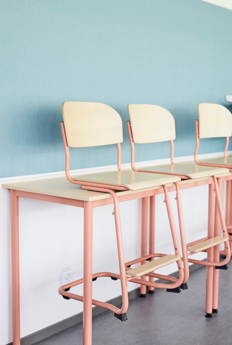 I kunstrommet sitter elevene ved høye arbeidsbenker og justerbare mattestoler, samme modell som i klasserommene. Vi har valgt en annen farge på stolstativene for å skille rommet fra de andre klasserommene. Målet er å gi elevene en tydelig følelse av å tre inn i et kreativt miljø hvor kreativiteten kan flyte fritt!