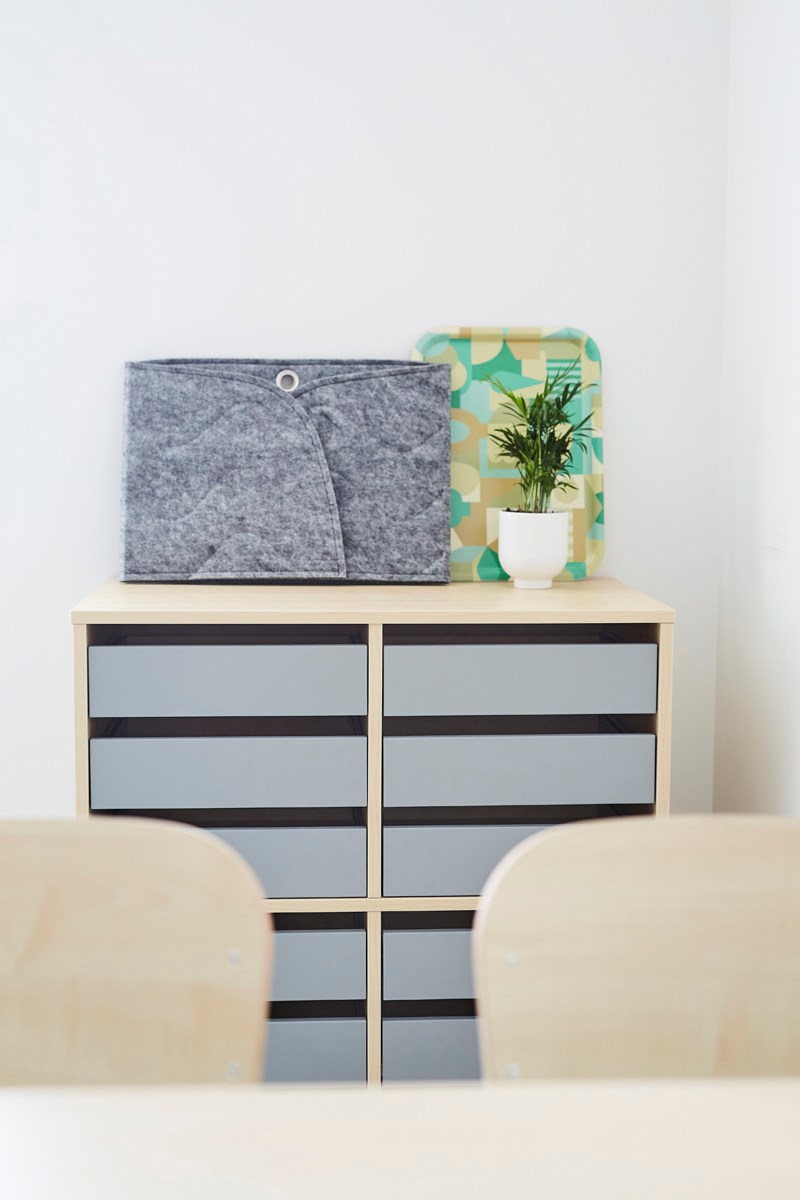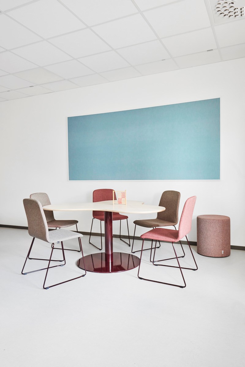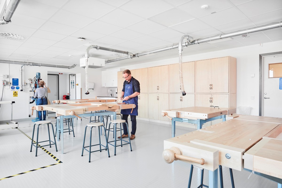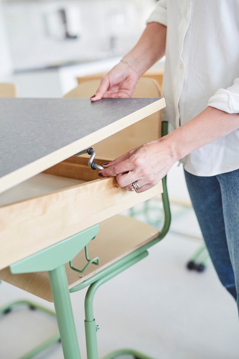 I kunstrommet sitter elevene ved høye arbeidsbenker og justerbare mattestoler, samme modell som i klasserommene. Vi har valgt en annen farge på stolstativene for å skille rommet fra de andre klasserommene. Målet er å gi elevene en tydelig følelse av å tre inn i et kreativt miljø hvor kreativiteten kan flyte fritt!