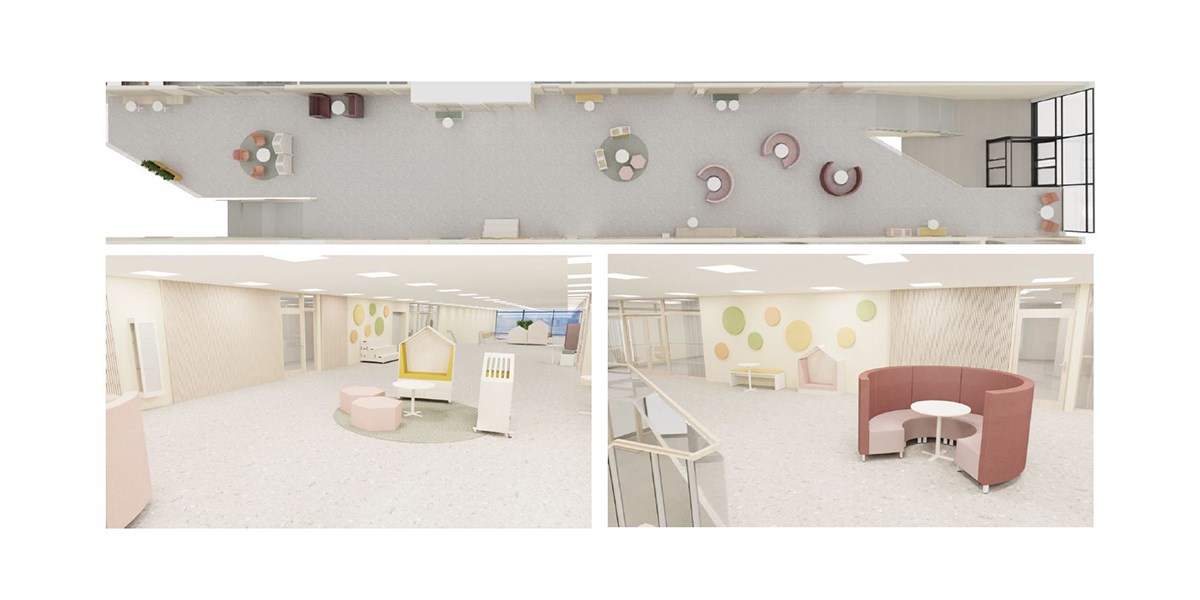 Lekolars interiørarkitekter Jessica og Ida presenterte et interiørforslag på et tidlig tidspunkt og her er en av alle 3D-skisser fra prosjektet som viser en av skolens luftige korridorer/offentlige arealer:
