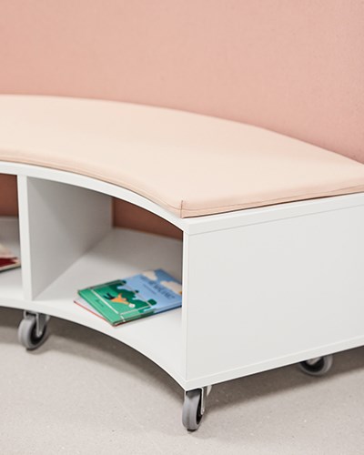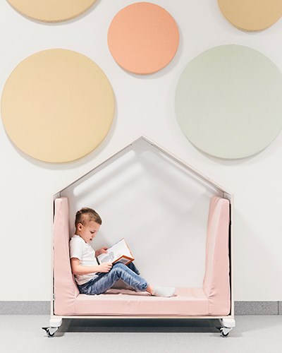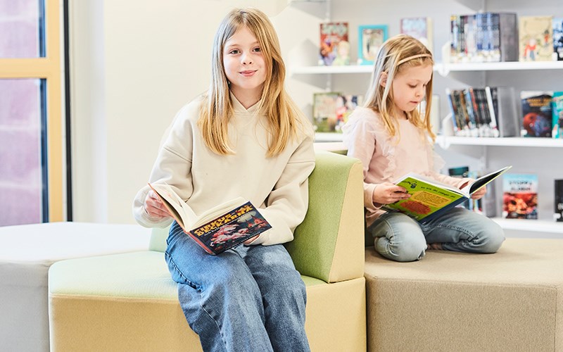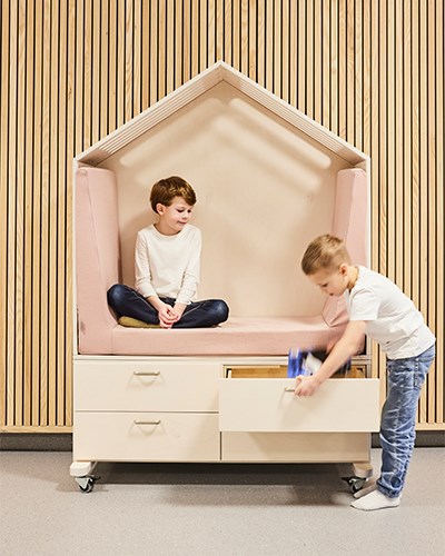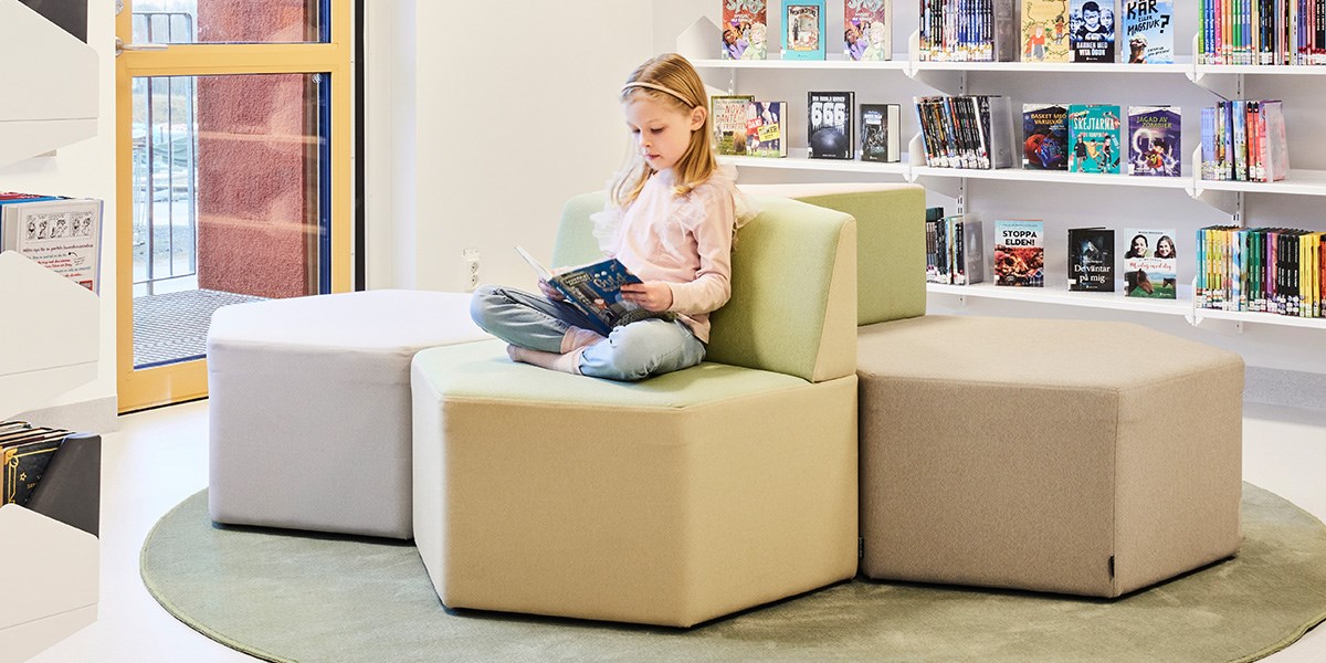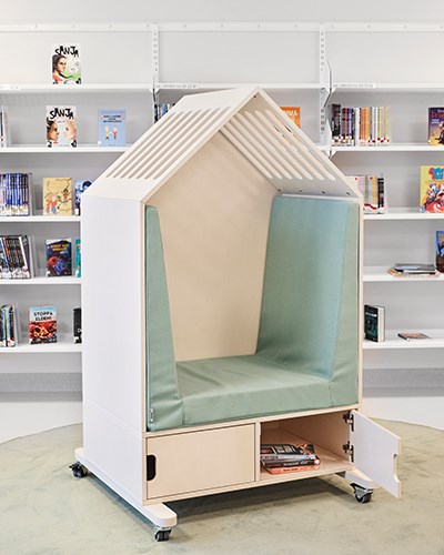 I en av korridorene er inngangen til biblioteket. En lys og frisk overflate hvor bøkene er samlet på det hvite og åpne Wille skinnesystemet. Når barna har valgt bok, byr biblioteket på mange koselige sitteplasser og krypkjeller i ulike former. Fixa buet og Fixa huset tilbyr både oppbevaring og sittegruppe. Takket være hjulene blir modulene mobile og kan enkelt flyttes rundt etter behov. De myke sitteputene (her med festet rygg) skaper en fin oase hvor barna kan sitte alene eller møtes og diskutere innholdet i bøkene. Teppet Rossini fungerer som en lyddemper sammen med de myke møblene og skaper også et koselig inntrykk.