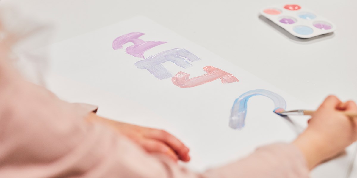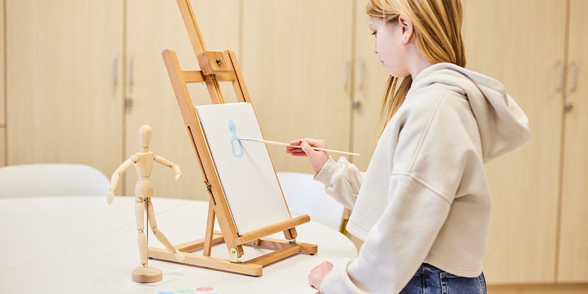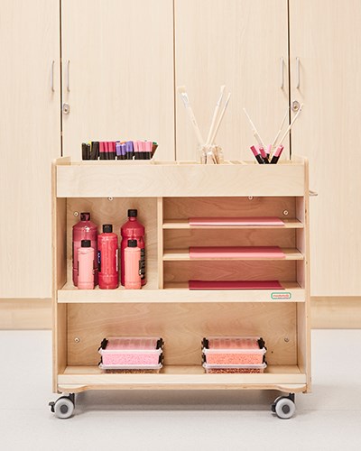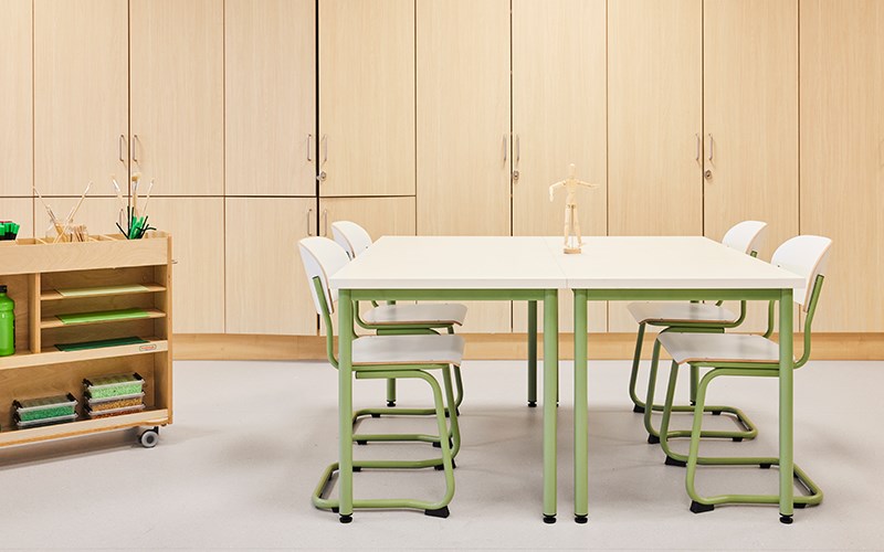 Hvem vil vel ikke sette seg ned og skape her? Formingsrommet har en harmonisk base hvor hvitt, grått og tre er gjenganger. Aksentfargene rosa, grønn og gul på bordet 12:38 og stol Matte skaper en livlig og kreativ følelse. Her er det rom for kreativitet i alle dens former, noe som tilrettelegges med den lille materialvogna! Her kan du også se kreative materialer som bordstaffeli, pensler, pastellfarger, paletter og tusjer.