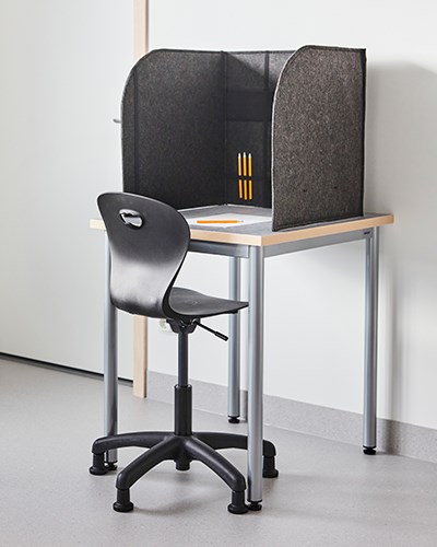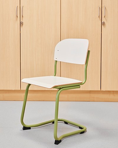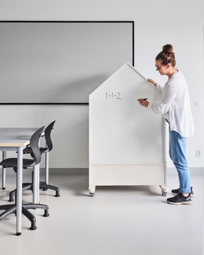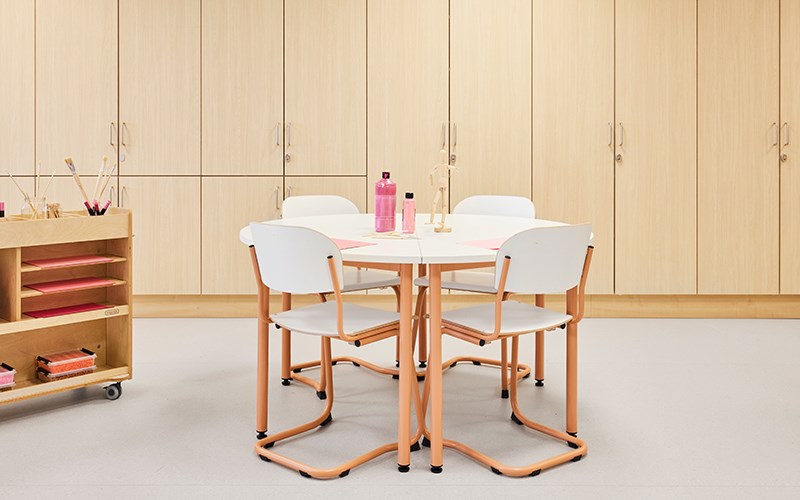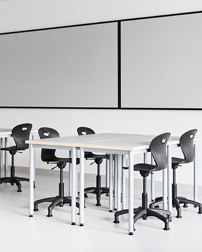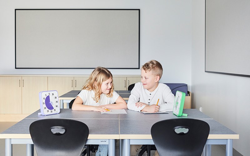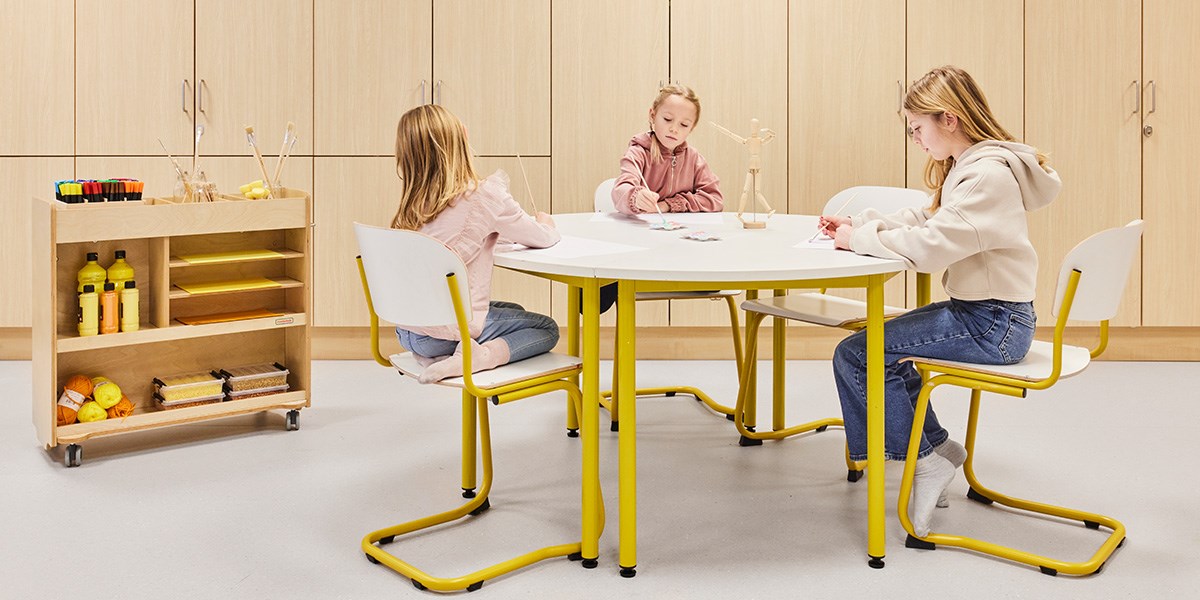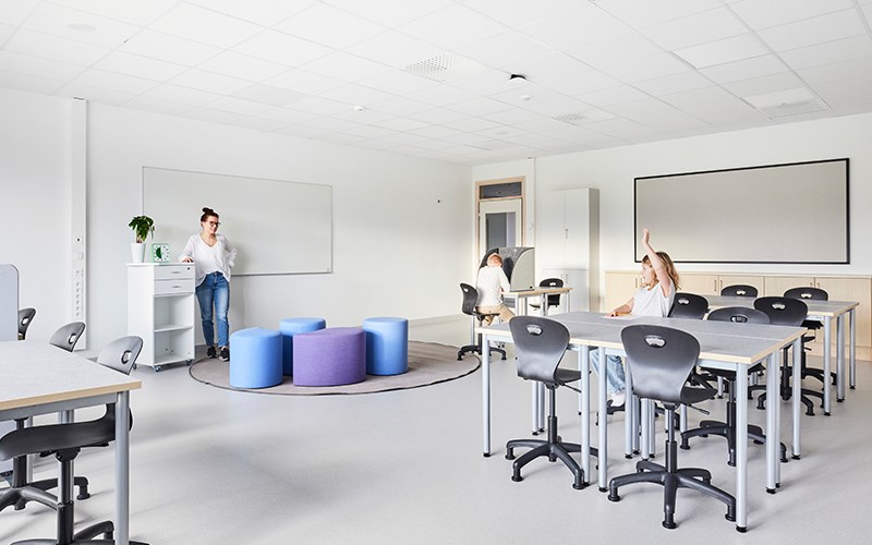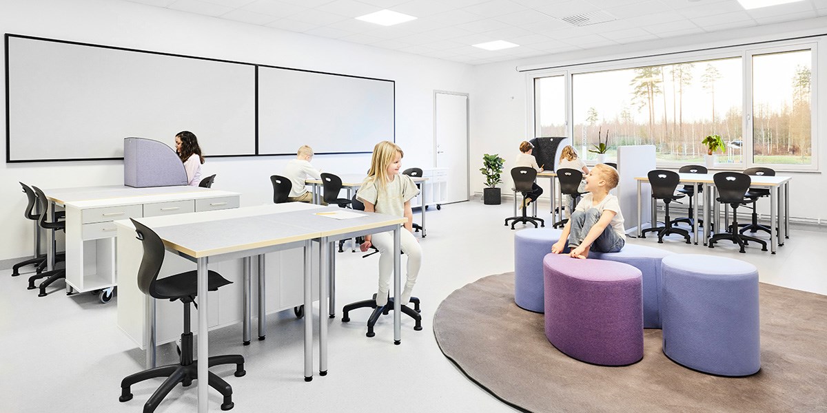 Skolens klasserom har base med Karoline og 12:38-bord sammen med Norden elevreol. Lyst, friskt og funksjonelt! Alle møbler kan enkelt flyttes for å skape tilpassede læringssituasjoner. Moviflex-mekanismen på Karoline lar barn vippe setet i alle retninger, noe som oppmuntrer til aktiv sittestilling. I tillegg har stolen et plastskall laget av 100 % resirkulert materiale, noe som gjør den til en miljøhelt! Rossini-teppet sammen med Volt-puffene myker opp og demper lyden. Det finnes også bordskjermer for barn som ønsker å skjerme av og fokusere bedre. Populære kompensasjonshjelpemidler som Time Timer®, bordskjerm med oppbevaring og dreiekloss kan også sees her.