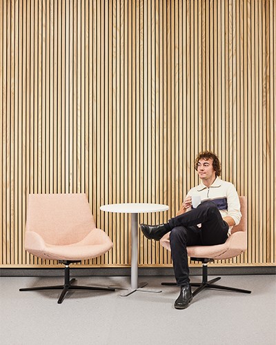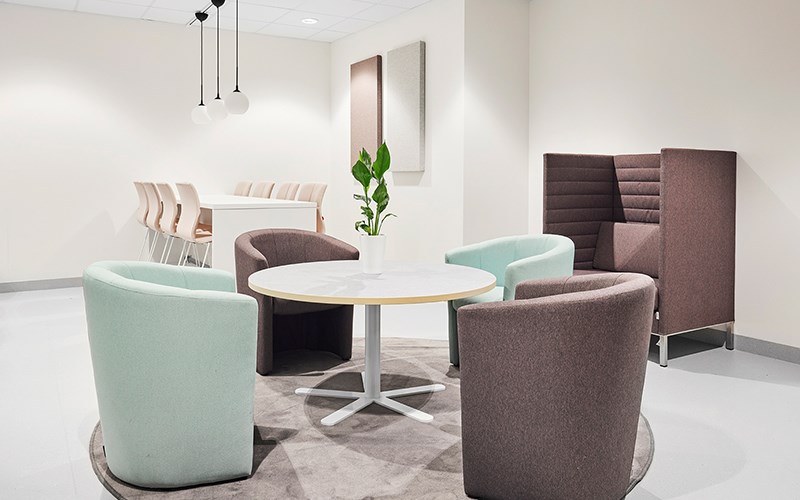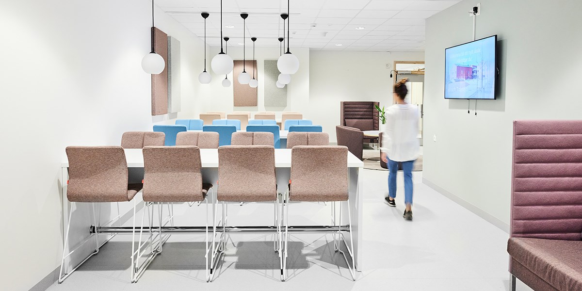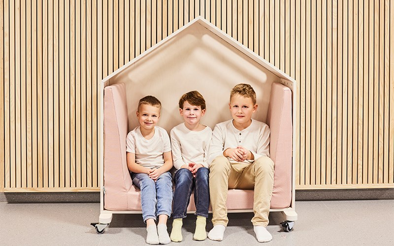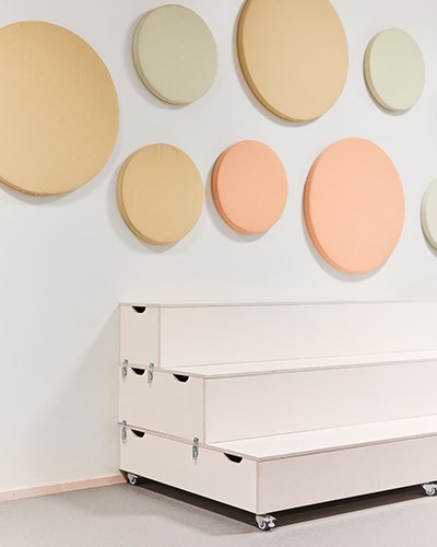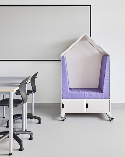 Skolen har to lyse og friske korridorer og fellesrom hvor elever og lærere kan møtes mellom timene. Her er det også plass til avskjermet alenetid, elevenes siste kunstprosjekter og pausesamtaler. Våre Fixa-hus på hjul fungerer som lyddempende krypkjeller der barna kan krype opp med en bok eller telefonen. Noen hus tilbyr også oppbevaring under. Vår modulsofa Snake danner små øyer sammen med søylebord Loke hvor barna kan møtes i pauser. En av lærerne på skolen sitter i Size-lenestolen og ved Korssøylebordet. Med Absoform lydabsorbentene på veggene reduseres lydvolumet og fungerer også som en fin dekorasjon over både scenetrapp og Fixa hus.
