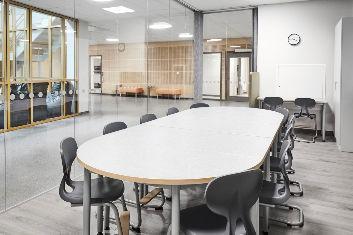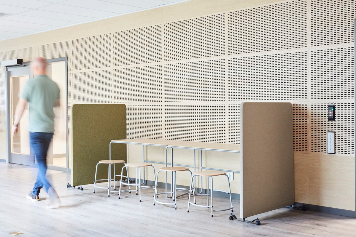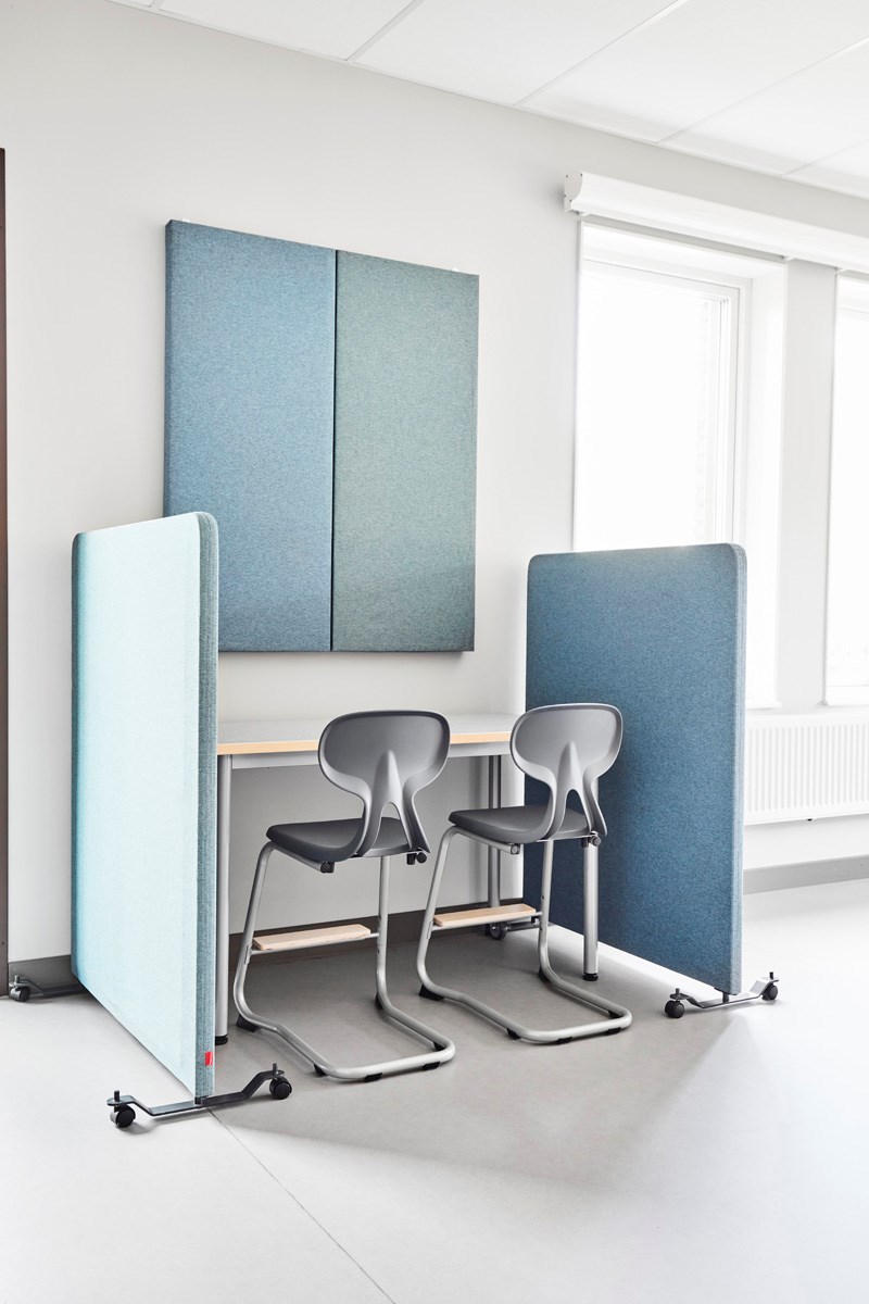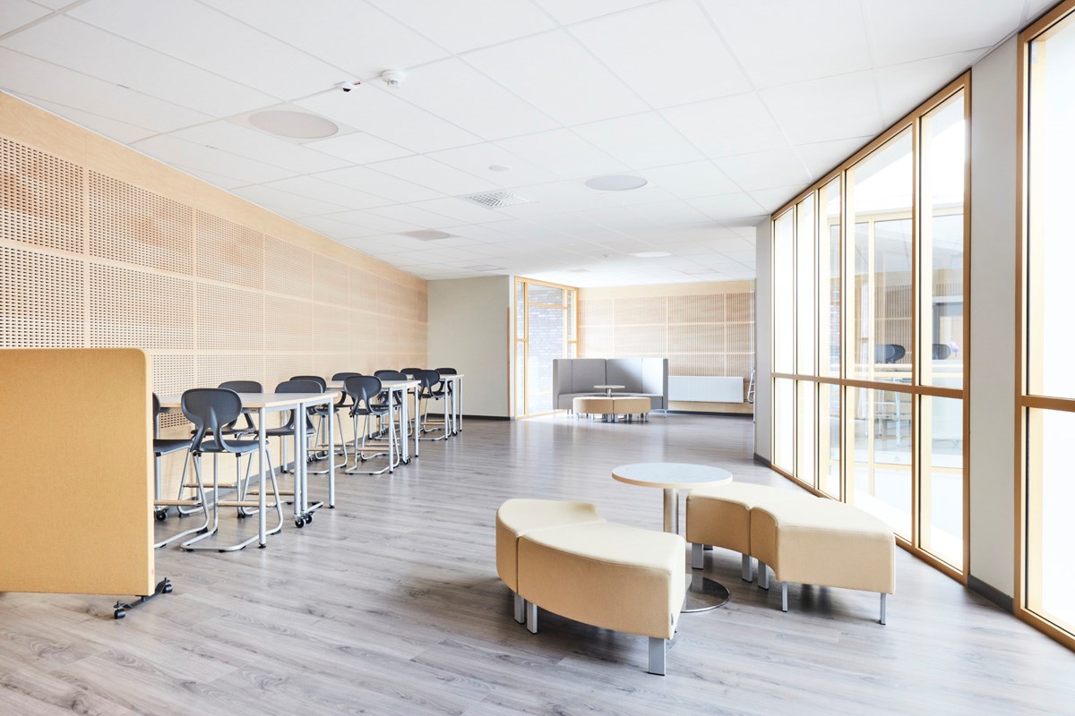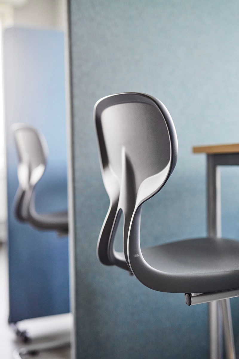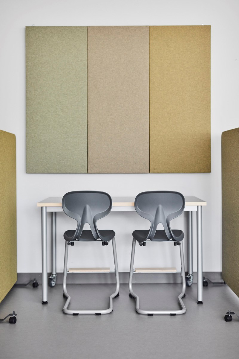 Gjennomgående møblering med Poly-stolen, studentbordet 12:38, lyddemperen Absoform, gulvskjermen Enkel, sofaen Snake med ryggstøtte og studentstolen Jessy i metall.