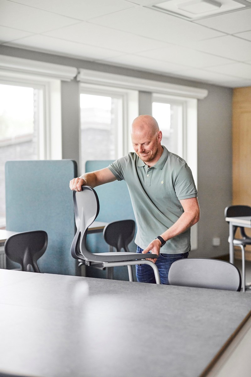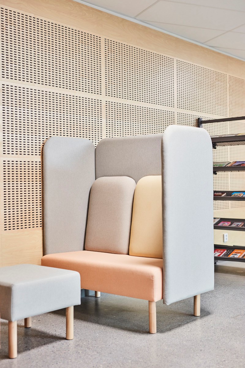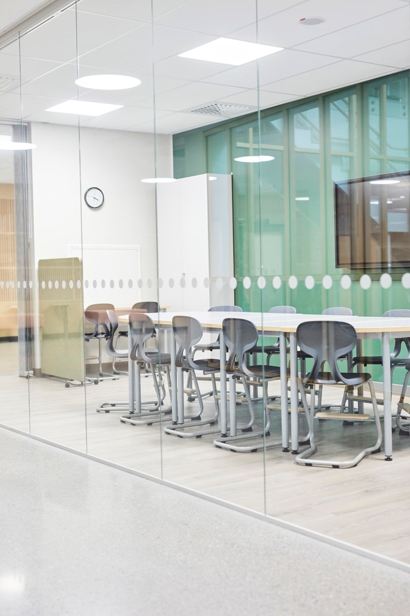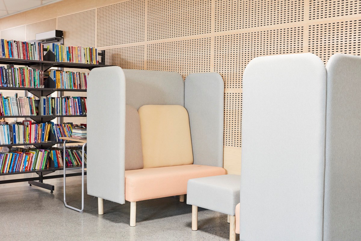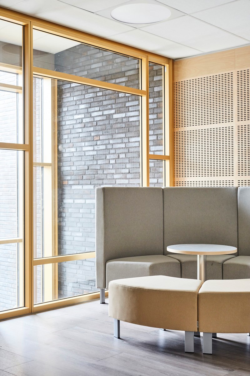 Gjennomgående møblering med Poly-stolen, studentbordet 12:38, lyddemperen Absoform, gulvskjermen Enkel, sofaen Snake med ryggstøtte og studentstolen Jessy i metall.