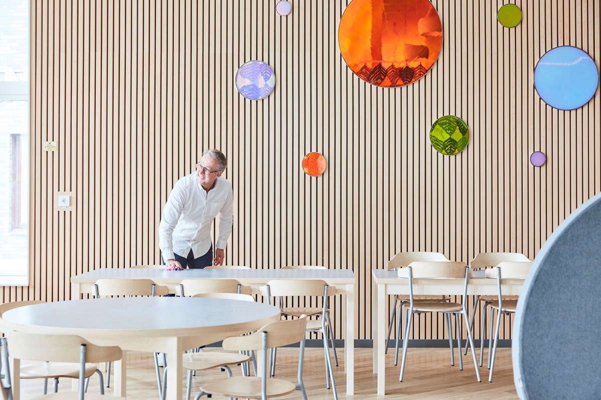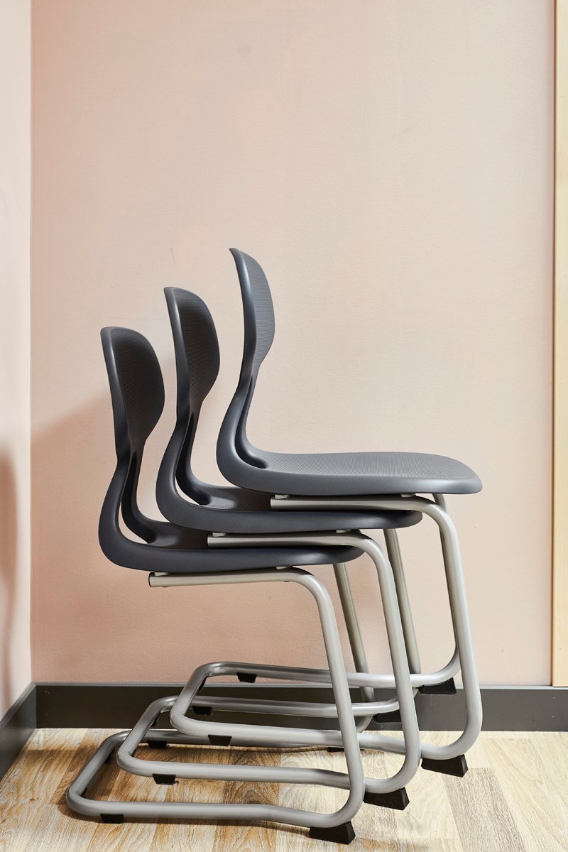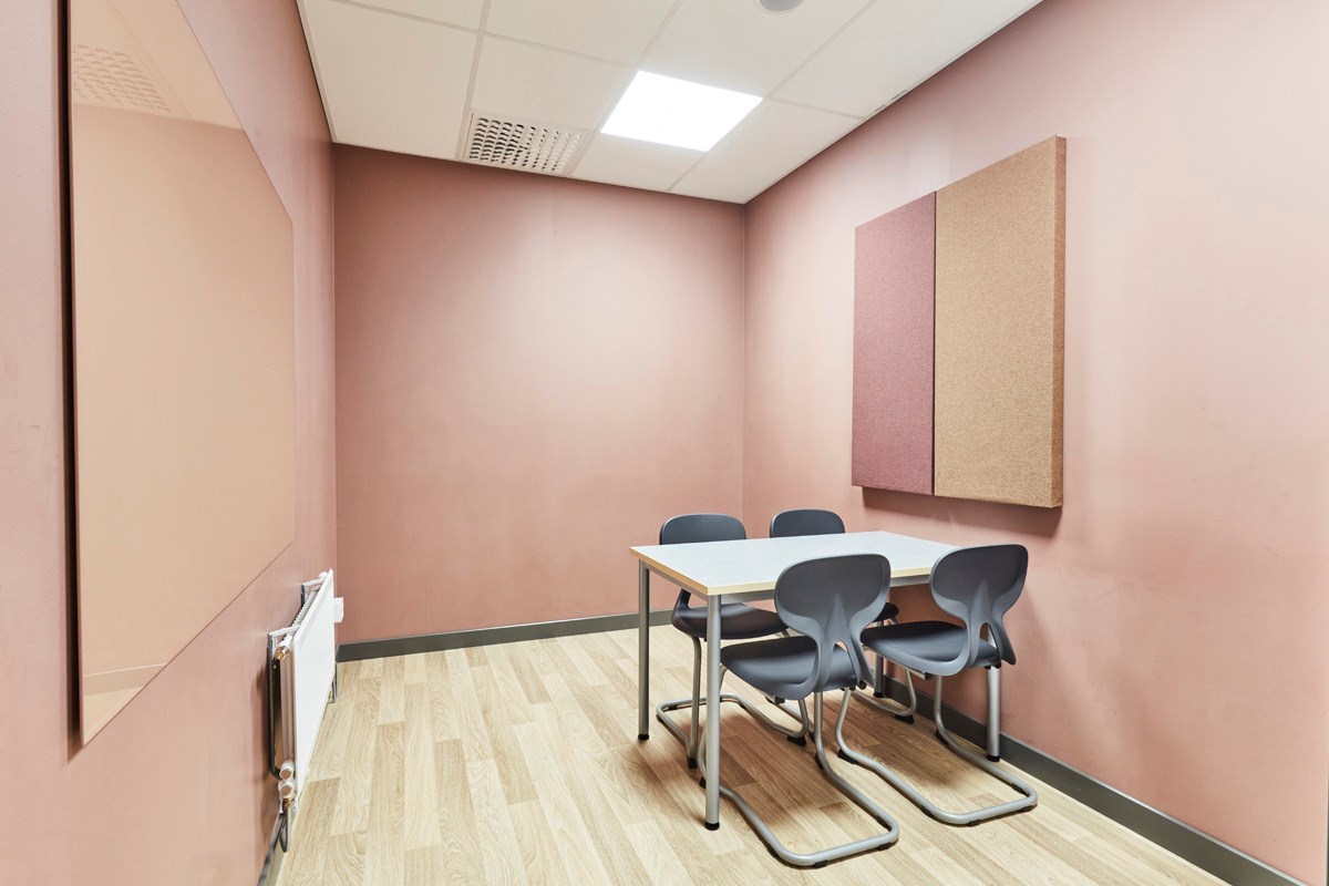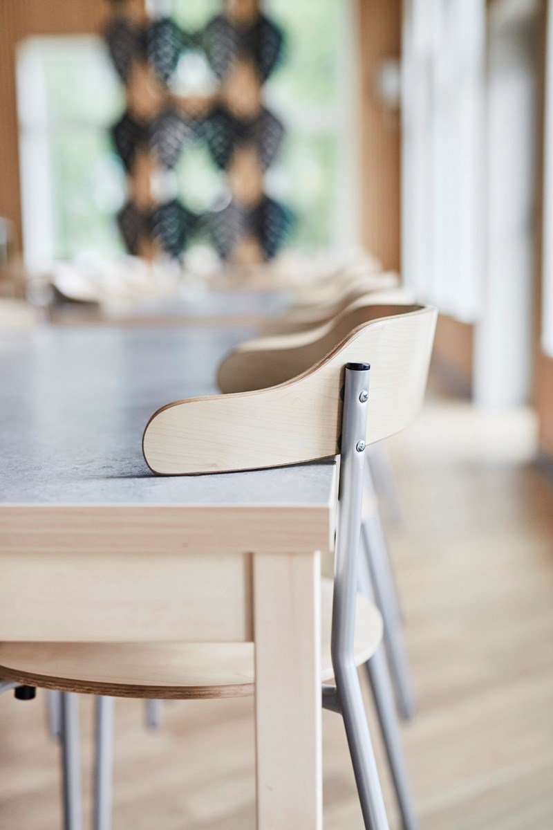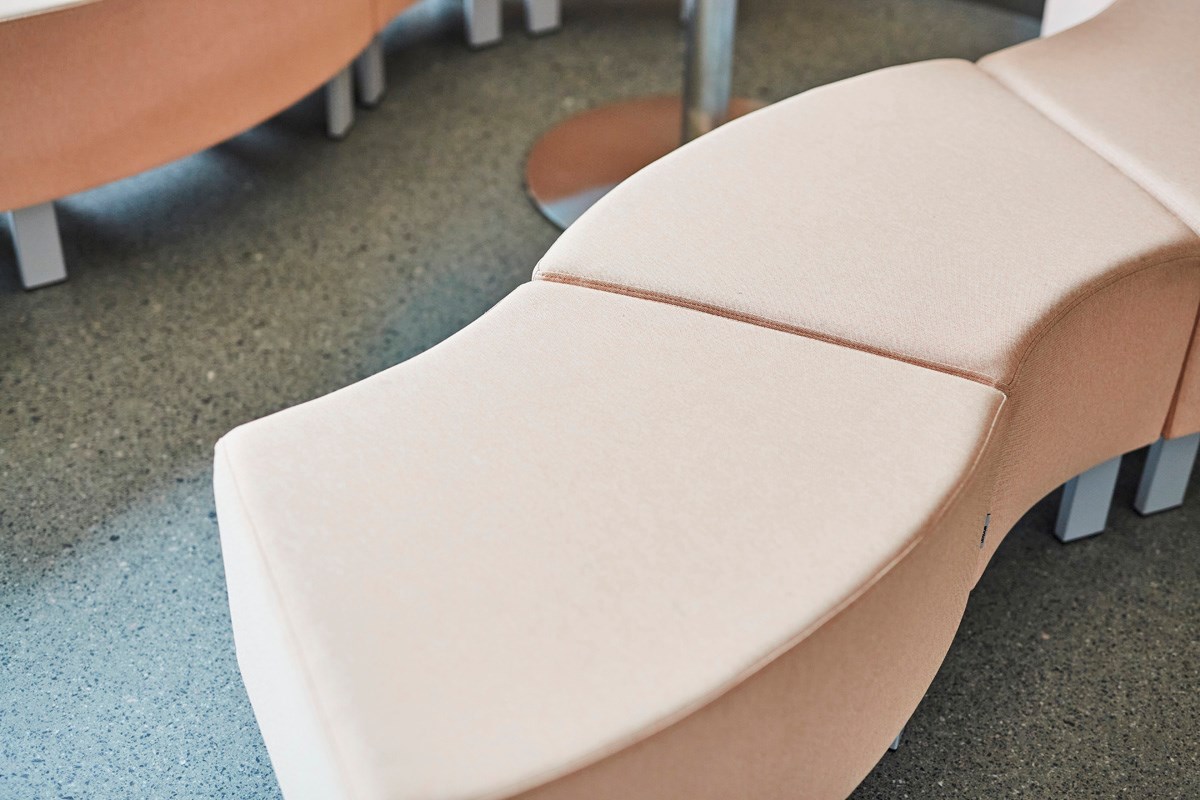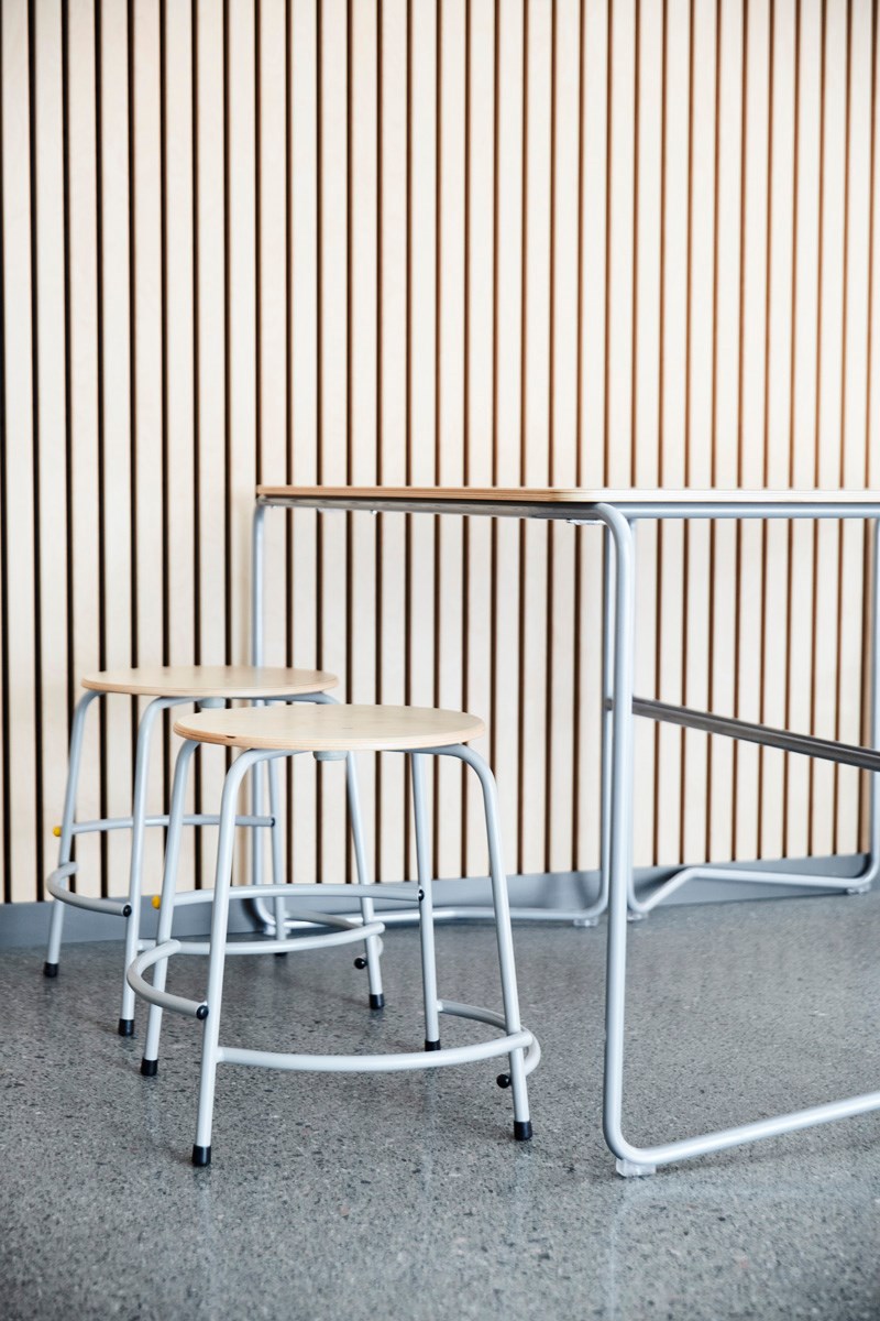 Gjennomgående møblering med Poly-stolen, studentbordet 12:38, lyddemperen Absoform, gulvskjermen Enkel, sofaen Snake med ryggstøtte og studentstolen Jessy i metall.
