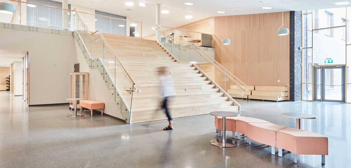Skolen består av fire bygninger som er koblet sammen via et lyst og åpent indre torg over to nivåer. Denne løsningen skaper god flyt mellom arealene og legger til rette for naturlige møteplasser og fleksibel bruk av fellesområdene.