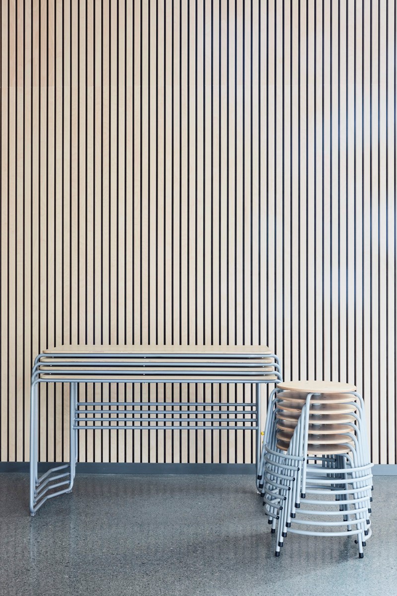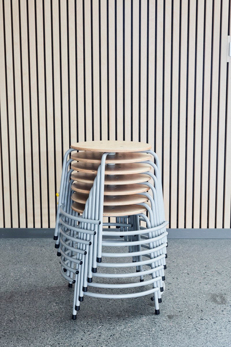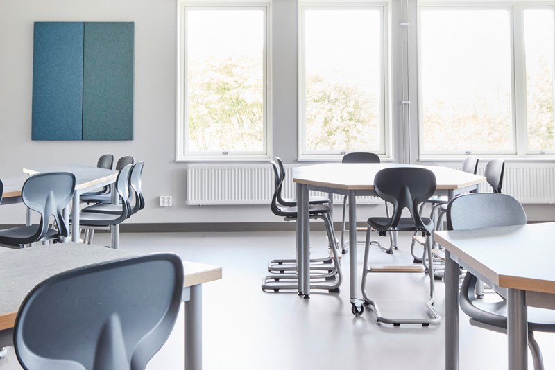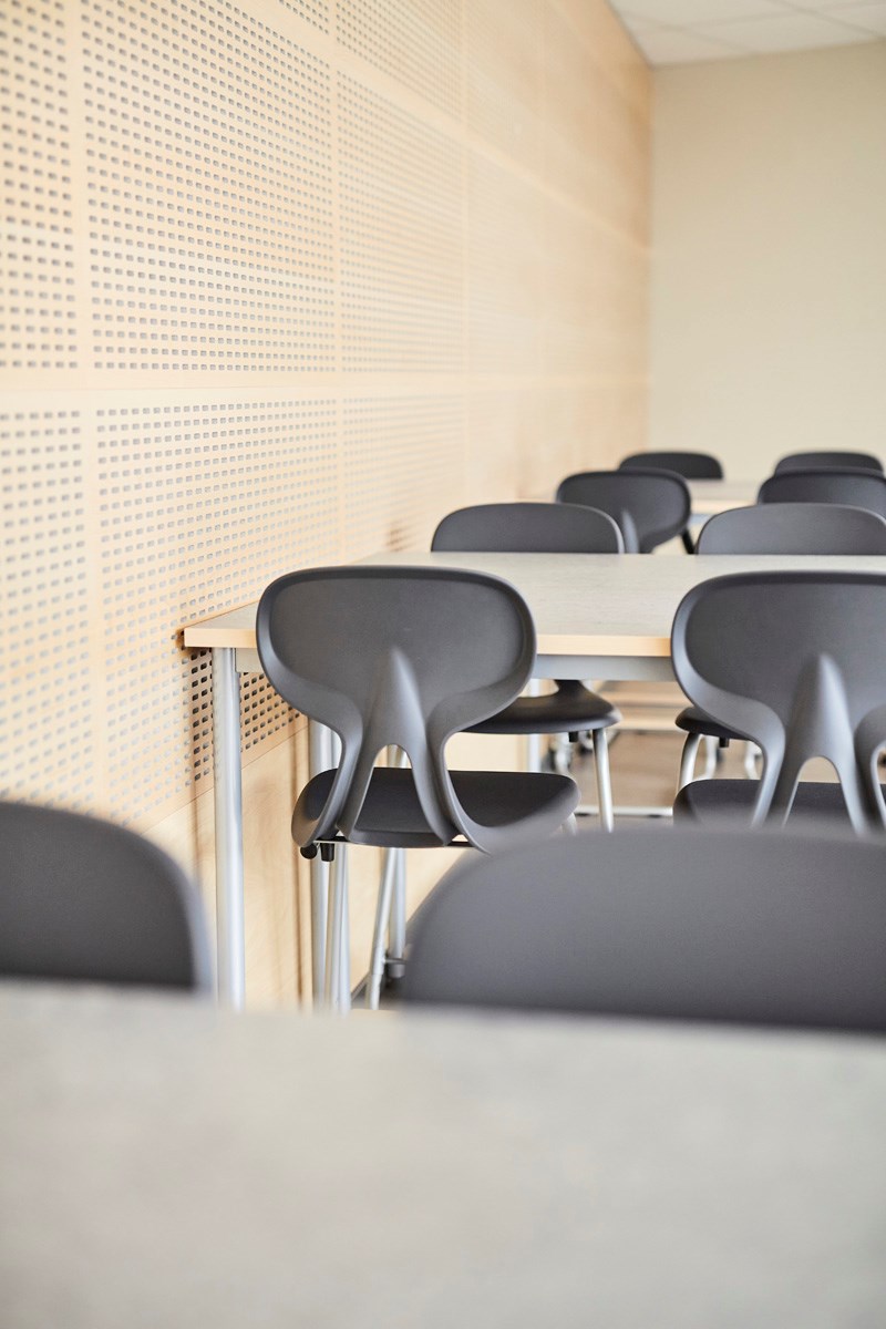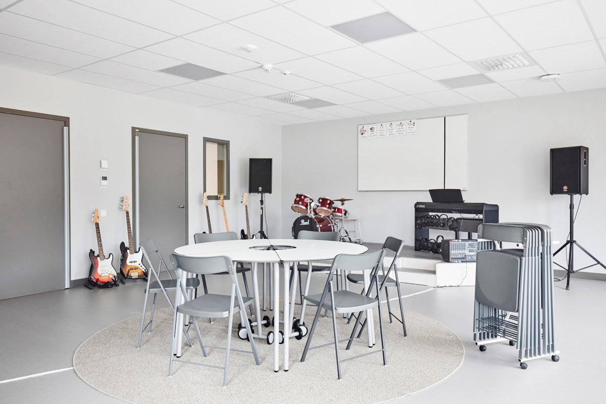 Musikksalen tilpasses enkelt ulike undervisningssituasjoner gjennom fleksibel møblering med elevbordet Flow og stablestolen Zeta, som gir rommet både funksjonalitet og mobilitet.