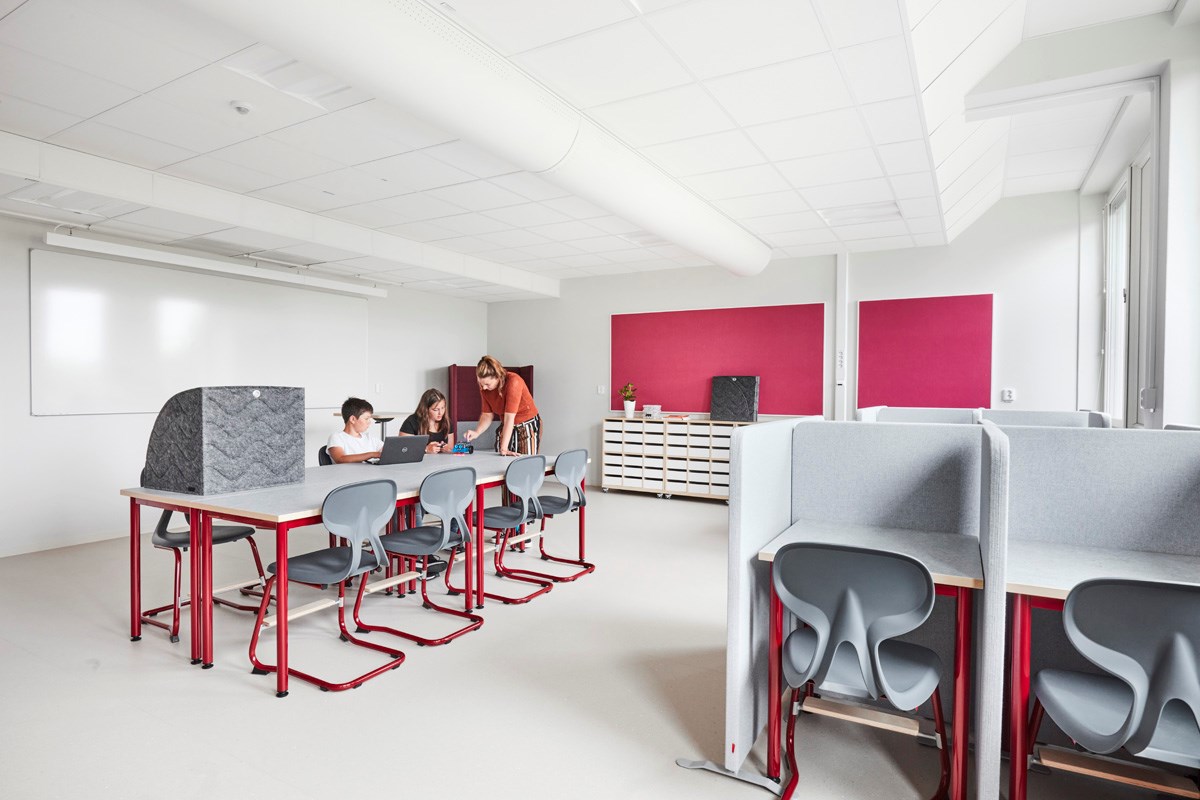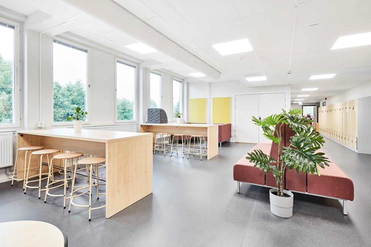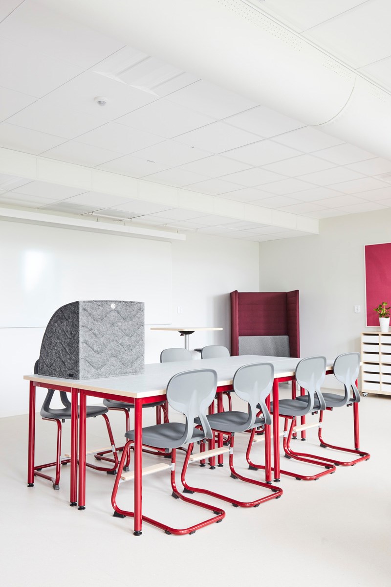 Klasserommene kombinerer tradisjonell møblering med fleksible løsninger. På ungdomstrinnet finnes også multimodale rom der elevene kan velge mellom ulike studie- og arbeidsmiljøer. Gjennomgående er møbler som Sofa Snake, elevbord 12:38, Poly-stoler, McBar, Multi-krakker, Sofa Liner, Volt-puffer og gulvskjermen Enkel benyttet for å skape varierte og inkluderende læringsmiljøer.