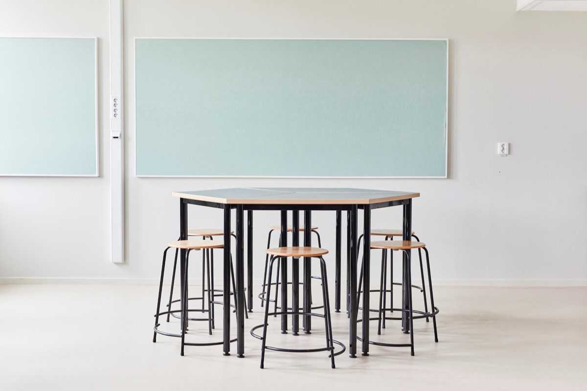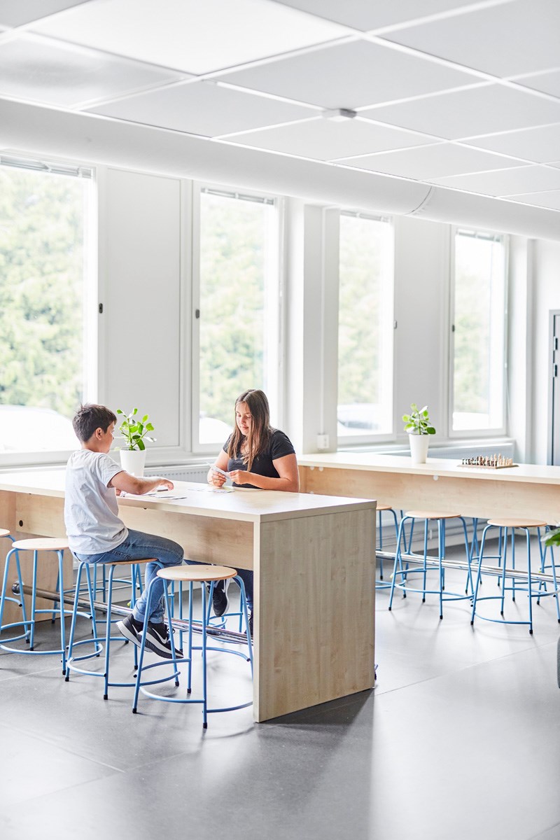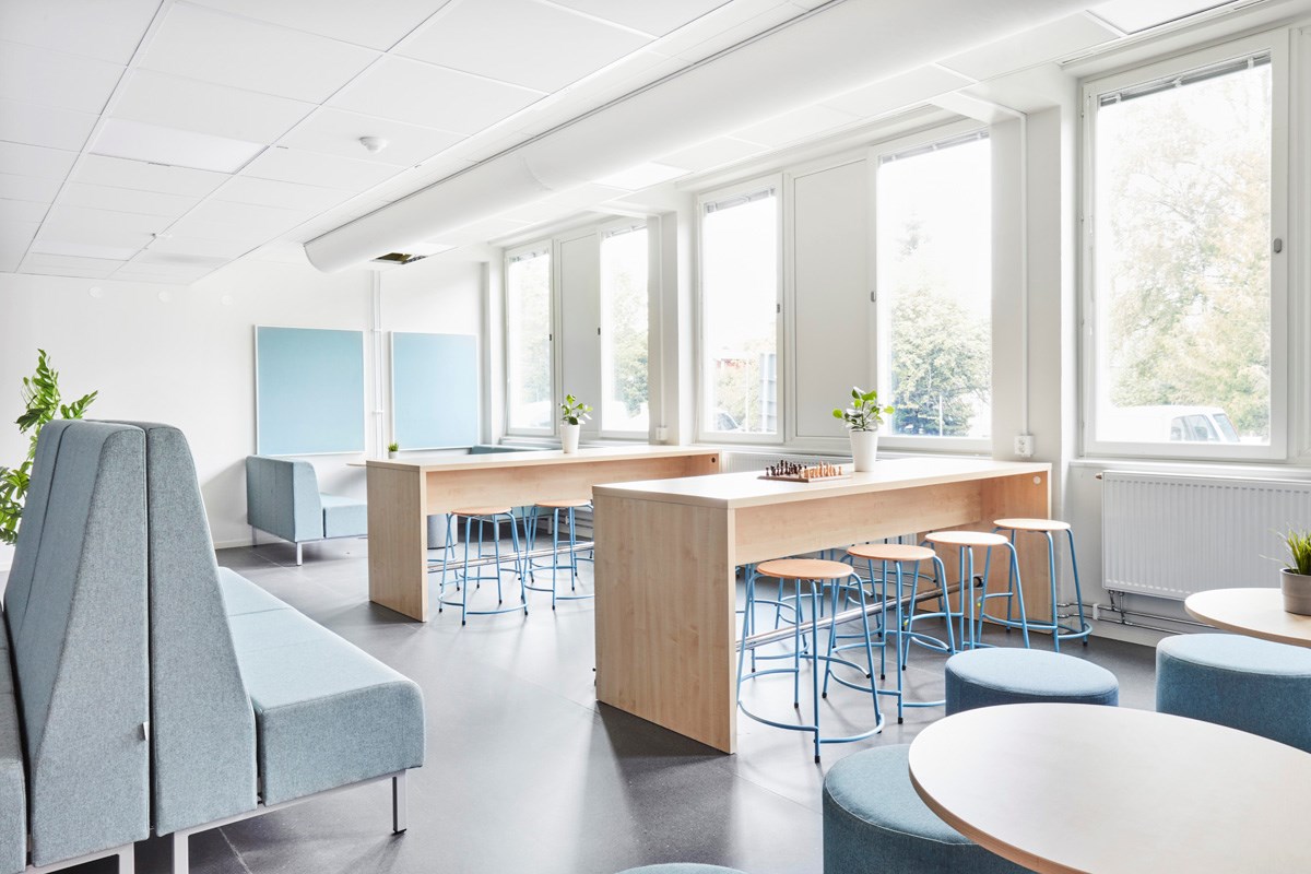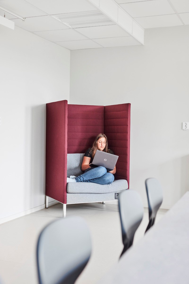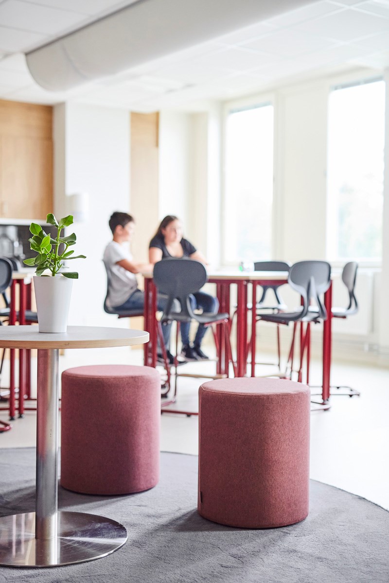 I fellesarealene skjermer sofaer med høy rygg mot korridoren og skaper rolige soner. Sofagrupper med bord gir rom for studier og sosialt samvær, mens barbordene tilfører variasjon og er et verdifullt innslag i studiemiljøet.