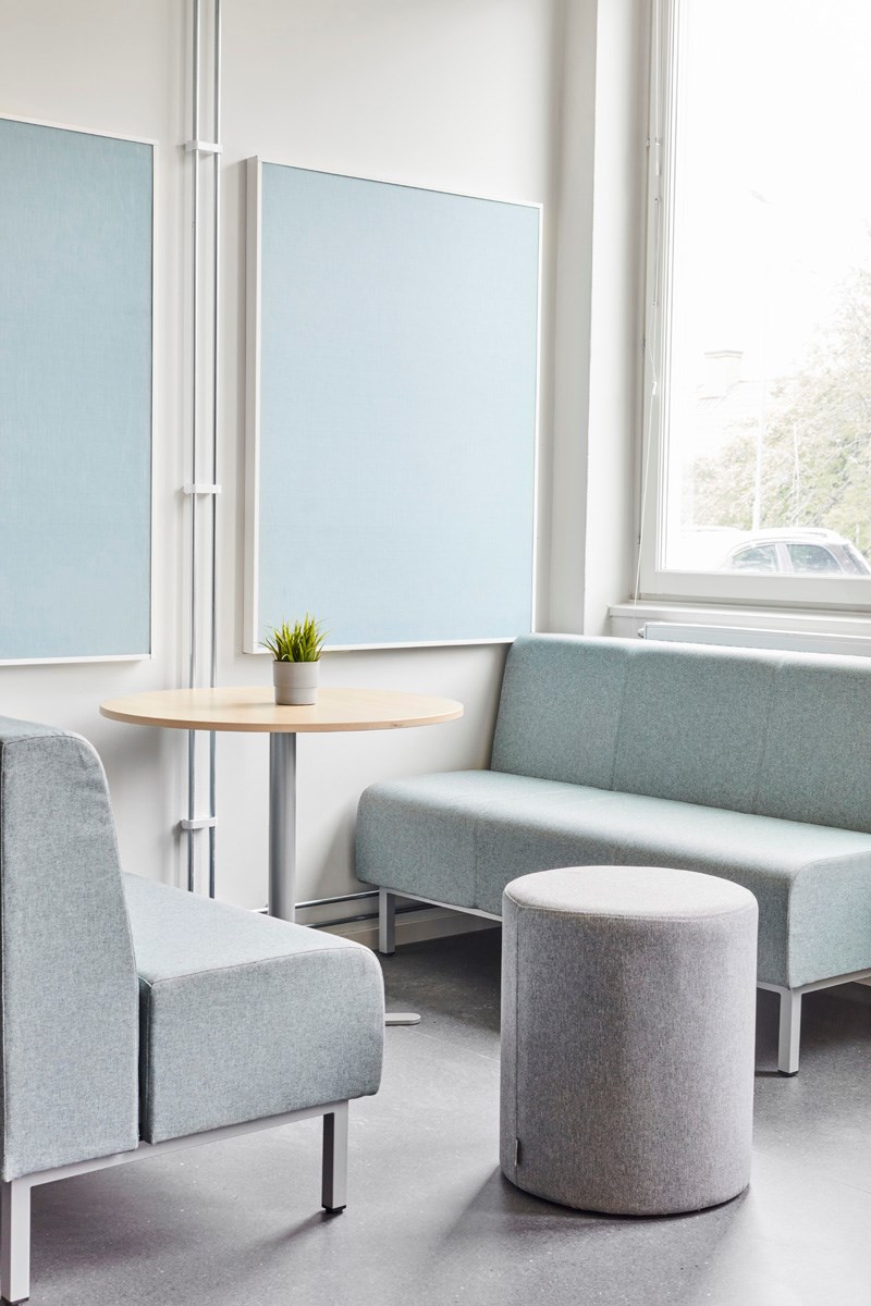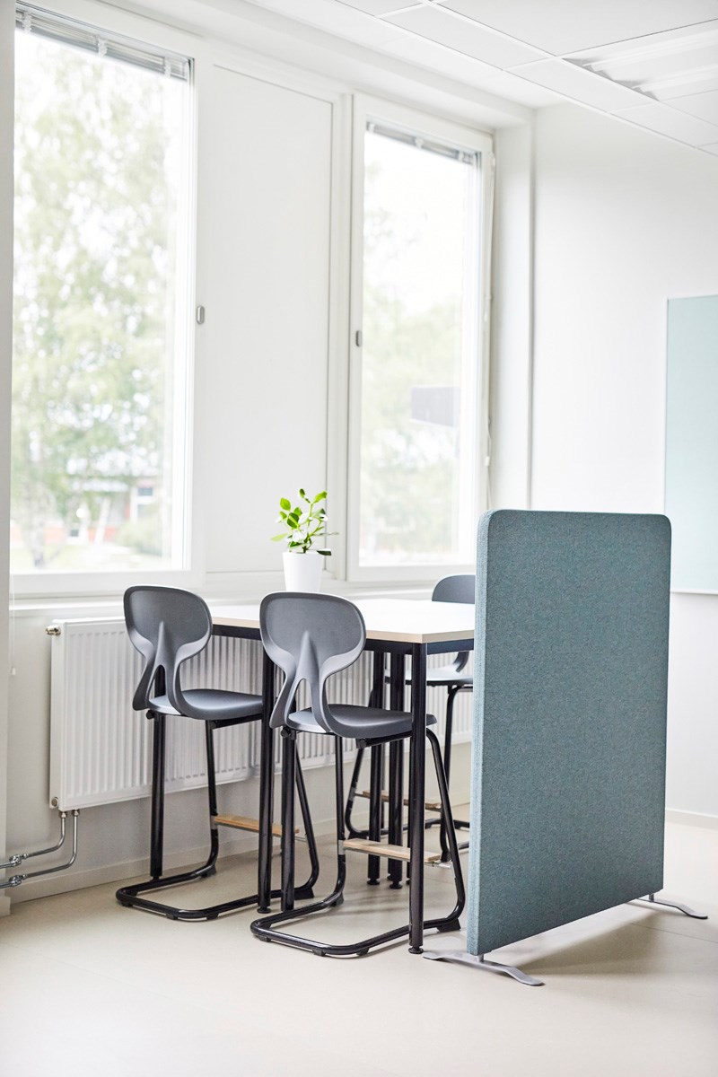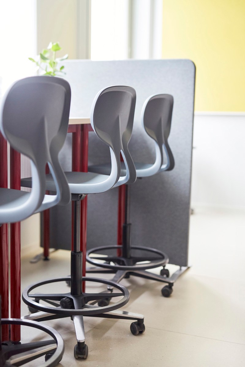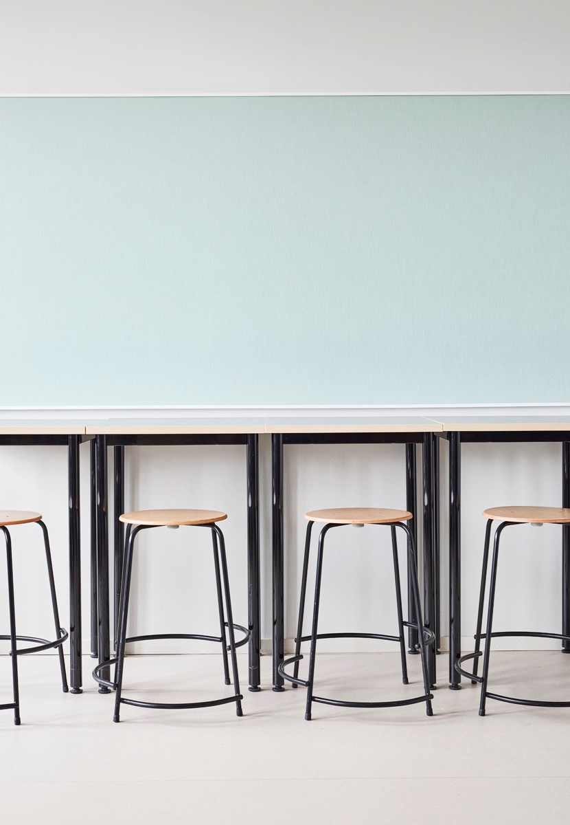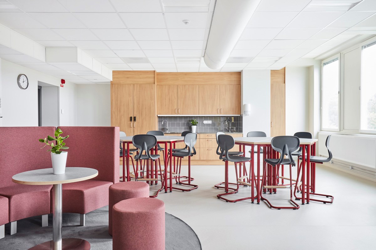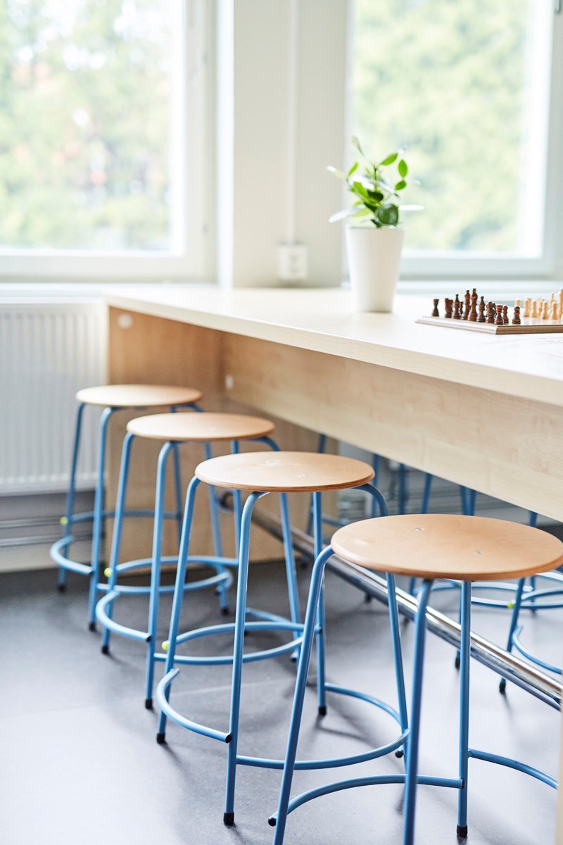 I fellesarealene skjermer sofaer med høy rygg mot korridoren og skaper rolige soner. Sofagrupper med bord gir rom for studier og sosialt samvær, mens barbordene tilfører variasjon og er et verdifullt innslag i studiemiljøet.