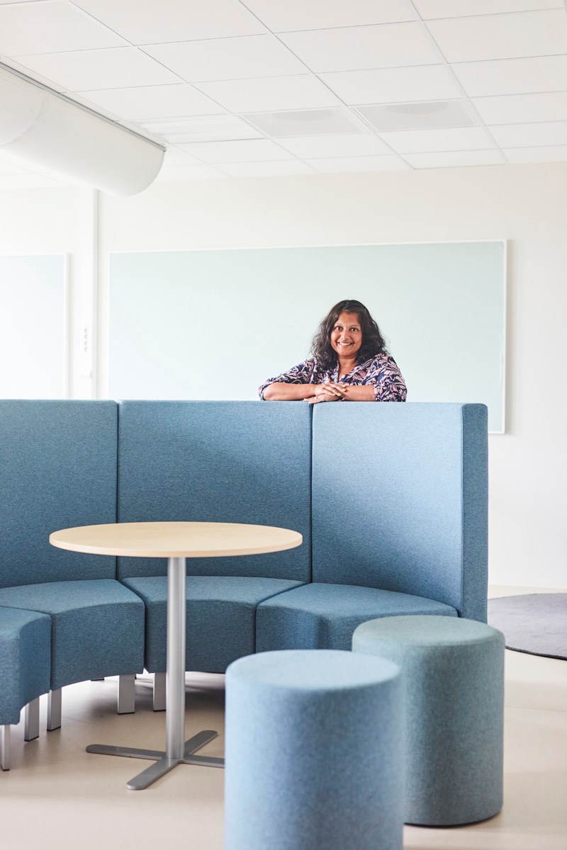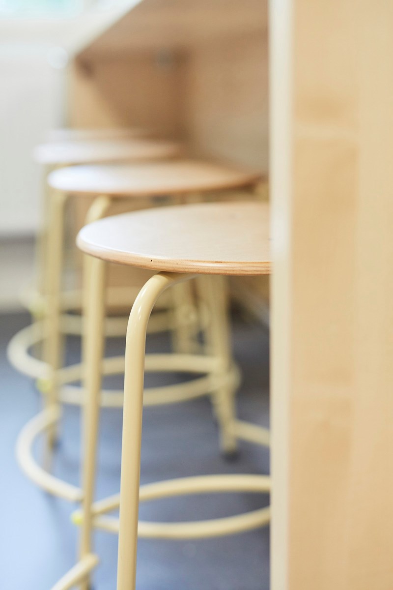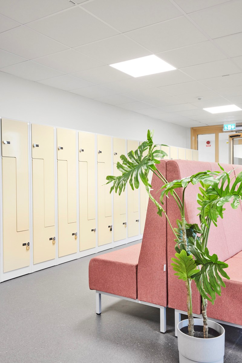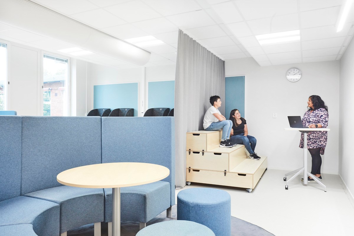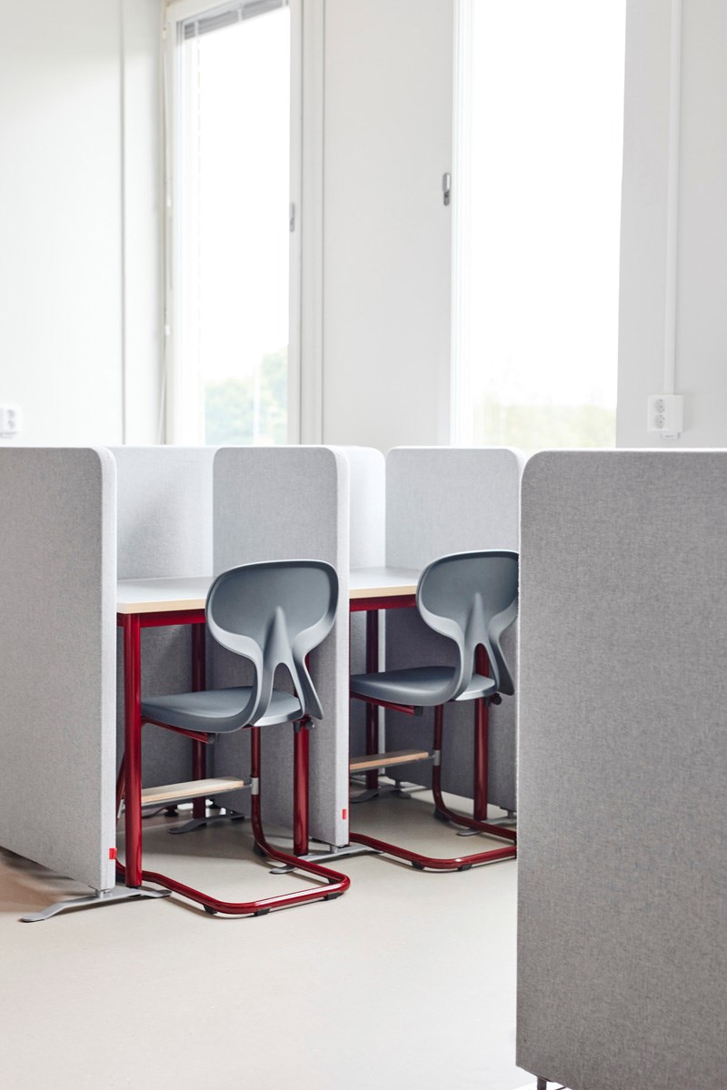 I fellesarealene skjermer sofaer med høy rygg mot korridoren og skaper rolige soner. Sofagrupper med bord gir rom for studier og sosialt samvær, mens barbordene tilfører variasjon og er et verdifullt innslag i studiemiljøet.