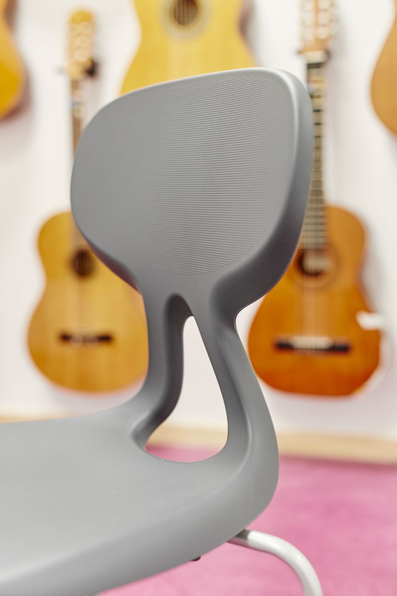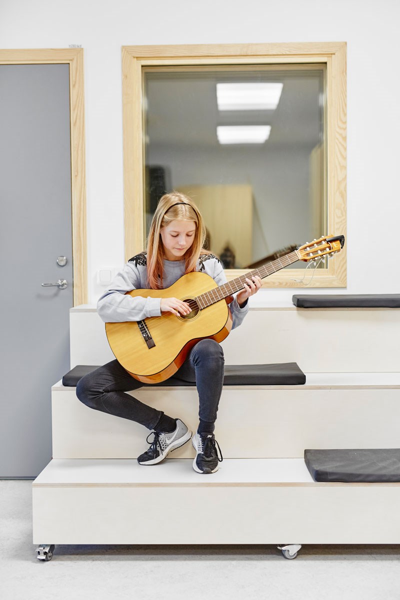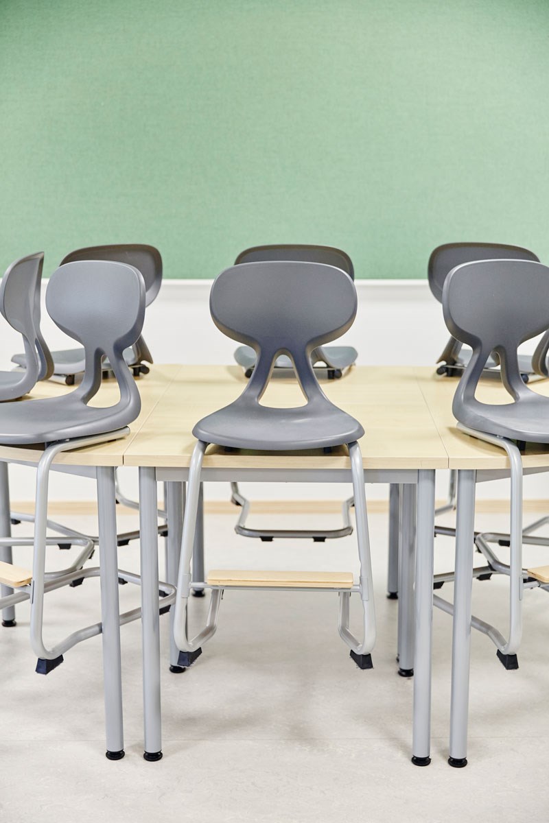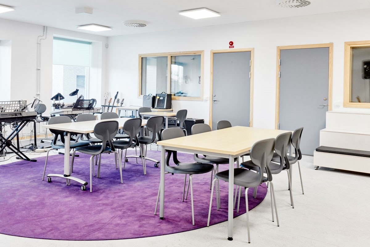 I skolens musikksal er det lagt dempende Rossini-matter for optimal akustikk. Møblene er fleksible og tilpasset for bruk i alt fra teoriundervisning til ensemblespill. Elevstolene, Poly 4, og elevbordet på hjul, Timo, gir stor fleksibilitet. De øvrige elevbordene, modell 12:38, er utstyrt med lyddempende akustikklaminat for å forbedre lydmiljøet.