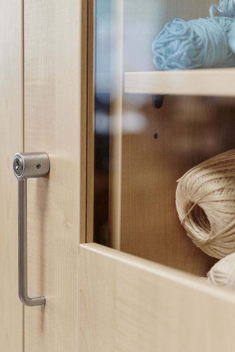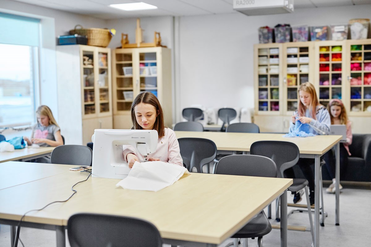 I tekstilsløydsalen er innredningen nøye tilpasset for å imøtekomme alle fagets ulike aktiviteter. Kombinasjonen av elevstolen Poly og elevbordet 12:38 sikrer en ergonomisk arbeidsstilling ved symaskinene. Tekstilsløydskapene er en del av oppbevaringsserien Norden, som gir både funksjonalitet og estetikk.