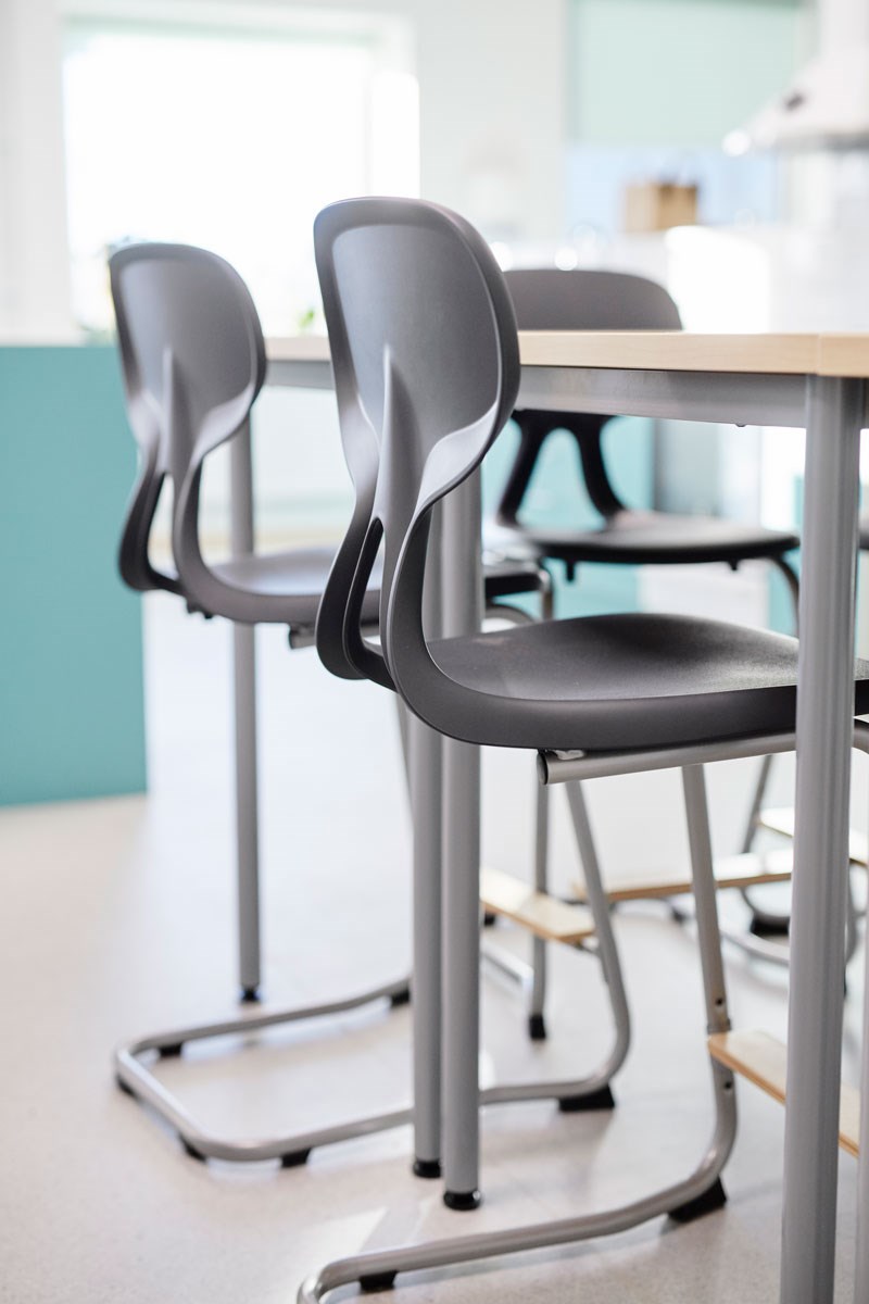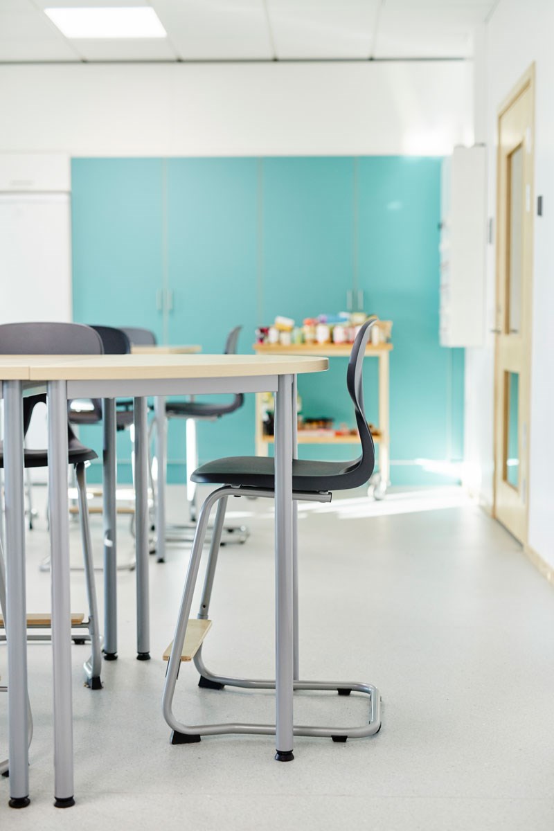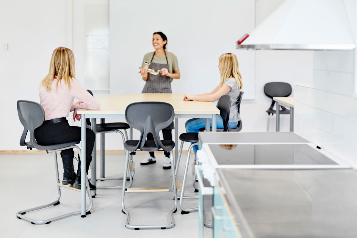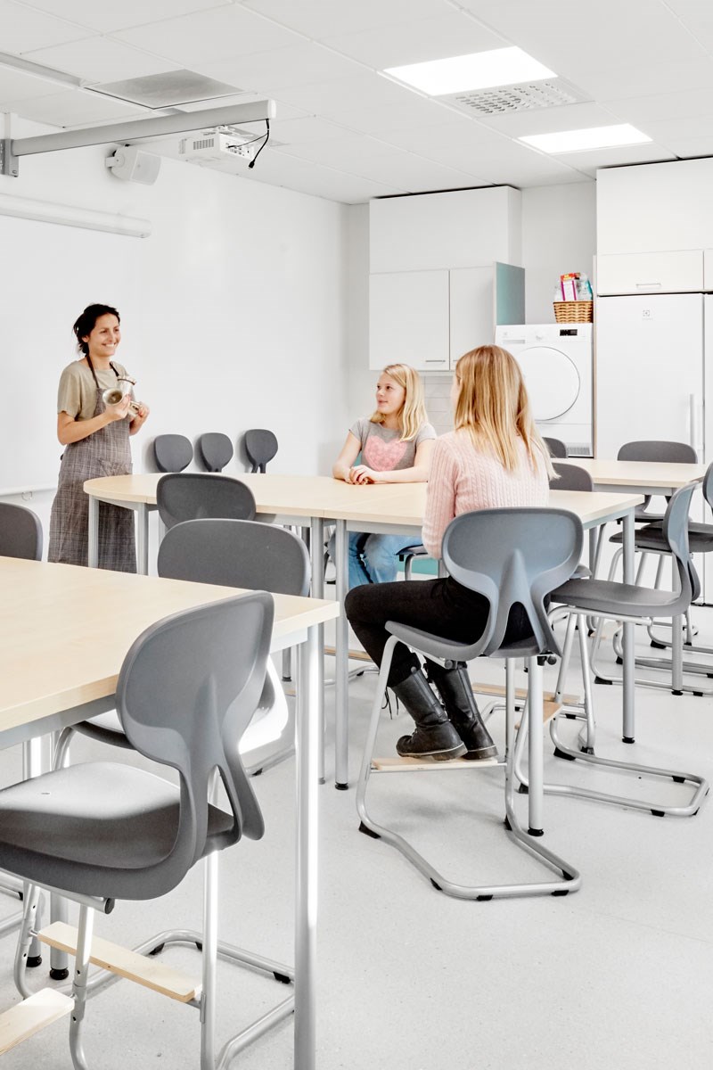 Västervångskolans lyse og funksjonelle hjemkunnskapssaler er designet for å håndtere alt fra matlaging til teorileksjoner. Møblene inkluderer elevbordet 12:38 med lyddempende akustikklaminat for en bedre lydmiljø, og elevstolen Poly som gir utmerket komfort.