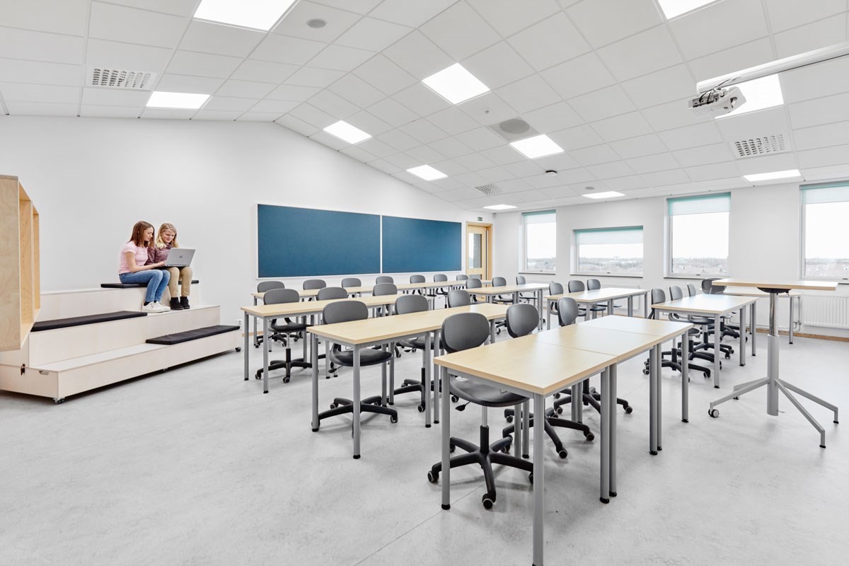 Klasserommene på Västervångskolan er ofte plassert to og to, hvor det ene klasserommet fungerer som et samlingspunkt for variert læring. Klasserommet har flere komfortable Platinum-sofaer, men også elevbord og elevstoler. Elevstolen Poly har en behagelig svikt og fleksibel ryggstøtte. Elevbordet 12:38 brukes gjennomgående på skolen, og skolen har valgt varianten med et lyddempende akustikklaminat for bedre lydmiljø.
