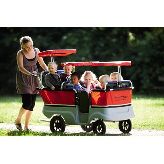 Med plass til 4 barn (max 15 kg) Mål: 155x75x96 cm, 30 kg. Maks kapasitet 70 kg. Barnebussen er en holdbar og meget sikker turvogn. Laget av hard UV-resistent polyetyen og herdet aluminium. Det røde stoffet er 100% polyester. Punkteringsfrie gummihjul med kulelager. Framhjulene er svingbare. Justerbart håndtak 93-105 cm. Den er lett å kjøre, selv fullastet med barn. Sikkerhetsseler i setene. Trommelbrems og automatisk parkeringsbrems. En fotskinne som gjør det lettere å komme over kanter. Regntrekk, solskjerm, myggnett og oppbevaringskasse under vogn, følger ikke med. Lekolar anbefaler service av bremsene annenhvert år.