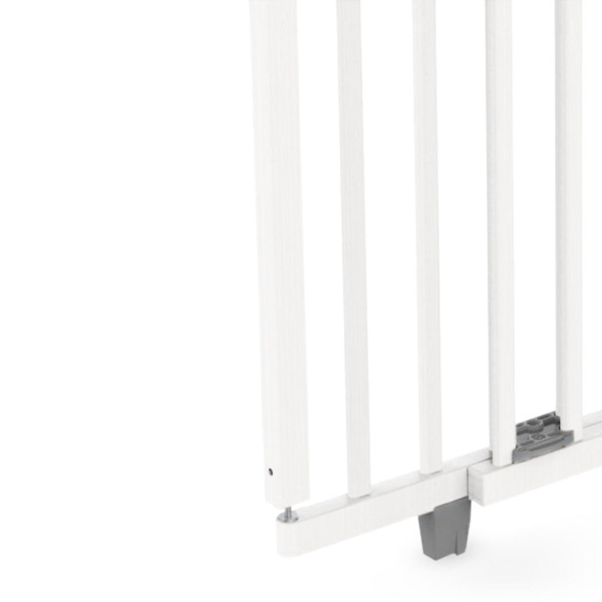 Stor og solid grind i hvitlakkert bøk som kan brukes i barnehager. Utstyrt med støttebeslag i bunnen som hindrer barn i å henge ned en åpen port. Robust låsemekanisme som er enkel for voksne å forstå hvordan den skal betjenes. Fri passasje uten list i bunnen. Grinden skrus fast i eller foran dørkarmen eller døråpningen. Justerbar innenfor en åpning fra 91,5 til 133 cm og justerbar foran en åpning fra ca. 80 til 121 cm. Godkjent i henhold til EN1930.