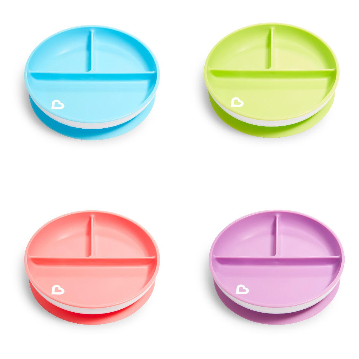 Tallerken med sterk sugekopp i bunnen som forhindrer søl og gris. Har en flik å dra i som gjør at tallerkenen enkelt kan løsnes fra bordflaten. Kan vaskes i oppvaskmaskin og brukes i mikrobølgeovn. Blandede farger. Materiale: PPCO, TPE. Fra 6 måneder.