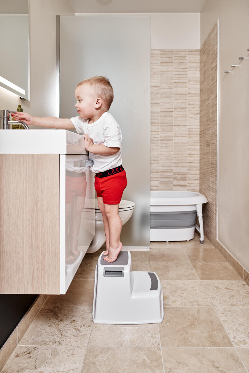 Stor og solid grind i hvitlakkert bøk som kan brukes i barnehager. Utstyrt med støttebeslag i bunnen som hindrer barn i å henge ned en åpen port. Robust låsemekanisme som er enkel for voksne å forstå hvordan den skal betjenes. Fri passasje uten list i bunnen. Grinden skrus fast i eller foran dørkarmen eller døråpningen. Justerbar innenfor en åpning fra 91,5 til 133 cm og justerbar foran en åpning fra ca. 80 til 121 cm. Godkjent i henhold til EN1930.