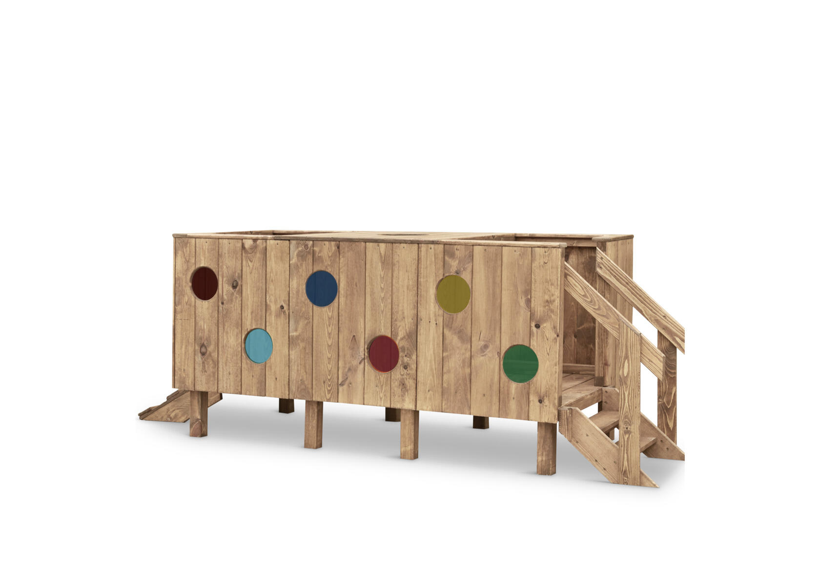 Denne eventyrlige oppdagelsesrampen tilbyr uendelige timer med lek i utendørsmiljøet, som for eksempel gjemsel, tittebø-lek og fantasifulle rollespill. Den stimulerer barna til aktiv og underholdende lek mens de løper rundt og utforsker tittehullsvinduene. Når lyset brytes gjennom det fargede plexiglasset, skapes fantastiske sensoriske opplevelser som stimulerer det visuelle sanseapparatet. Barna kan ta seg opp på rampen via en trapp med rekkverk på den ene siden, eller via en skrånende rampe på motsatt side. Laget av FSC-sertifisert furu som er overflatebehandlet med en vannbasert lakk. For markforankring trengs 4 stk av 161297, eller 151133 for overflatemontasje. Leveres umontert.
