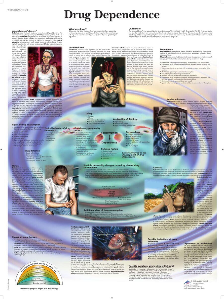 Laminert plansje med fakta om ulike rusmidler og deres virkninger. Overflaten er slitesterk og kan tørkes av ved bruk av ikke‑permanent penn. Plansjen tar for seg rusmidlene amfetamin, ecstasy, kokain, crack, heroin, hallusinogener, LSD, cannabis og inhalerte substanser. Teksten er på engelsk. Laminert i miljøvennlig plast. Mål: 50×67 cm.