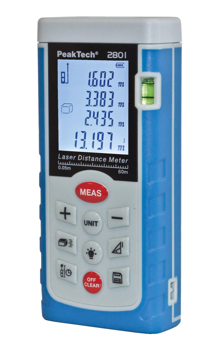 Laseravstandmåler med flerlinjet LCD-display og bakgrunnsbelysning. Designet for avstandsmålinger med høy presisjon på avstander fra 0,05m til 60m. Måleren har et uttrekkbart 90°-feste og innebygget vater for å kunne levere et nøyaktig målepunkt med ± 2 mm avvik. Den er enkel å bruke og har internminne for 99 registrerte måleverdier, kommer med koffert, batterier og bruksanvisning. Størrelse: 118 x 54 x 28 mm. Vekt: 135 g