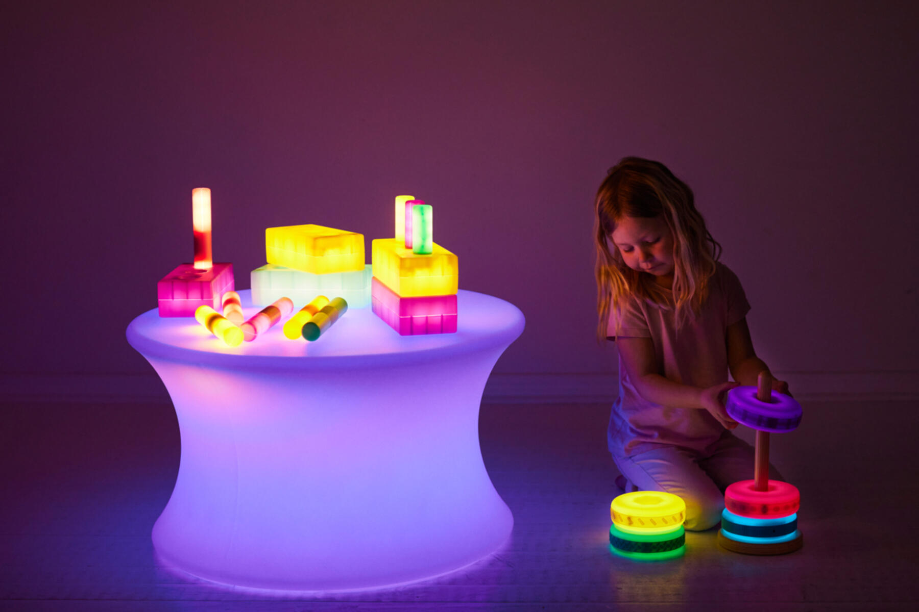 Bruk disse lysende sensoriske ringene til å bygge med. De er oppladbare og lyser i 1 min når du rister dem. Hver ring har en ulik struktur på utsiden som er spennende å føle på. Pinnen som vises på bildene kan kjøpes separat på art nr 130467. Mål pr ring: Ø15 cm, 4 cm tykke. Inkludert i pakken er også en dockingstasjon hvor du lader alle 5 ringene. Av ABS med silikondeksel. Dockingstasjon i ABS. Fra 10 mndr.