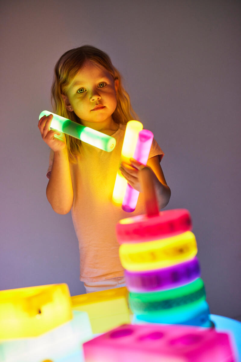 12 interaktive staver som lyser opp når du trykker på dem. Lær om årsakssammenheng og få respons på en bevegelse når den lyser (den lyser i 3 minutter). Stavene passer til konstruksjon, matematikk, sensoriske øvelser og rollespill. De kan brukes alene eller sammen med andre lysende produkter. I leken kan stengene gjøres om til en telefon, en slange eller en rakett! De er også morsomme å danse med, kanskje i mørket. De er også morsomme å sette på lysbord for ulike effekter. 6 forskjellige farger. 3-4 timers ladetid gir 6-8 timer strålende leketid. Lades med USB-kabel. Mål: 21,2x3,3 cm. Fra 10 måneder.