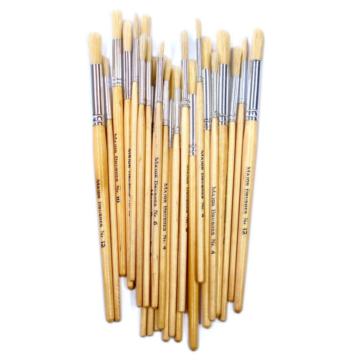 50 stk/pk. Hobbypensler med rund, solid, hvit svinebust og treskaft. Sett med 5 ulike størrelser: 4, 6, 8, 10 og 12. Egnet for maling med tykkere farger, f.eks. olje-, akryl-, batikk- og readymix. Skaft ca. 17 cm.