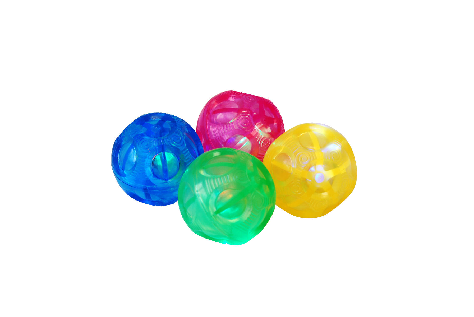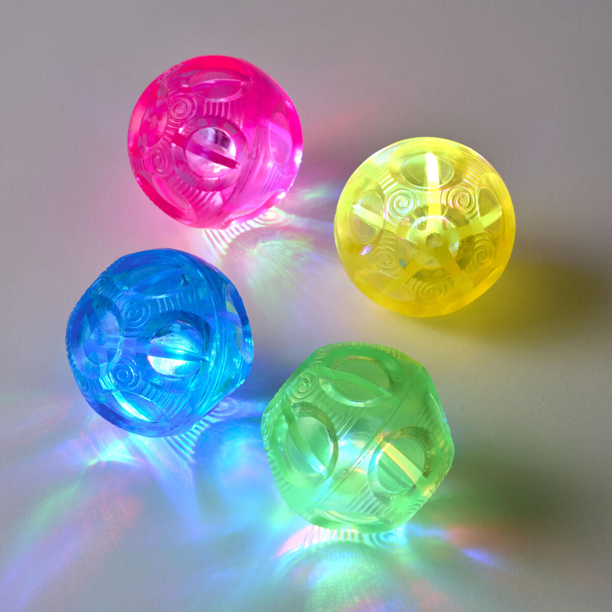 Sensoriske baller som lyser opp og blinker når de sprettes. De blinker uregelmessig og har ujevne flater som spretter i ulike vinkler år de treffer gulvet. 4 lyse farger: blå, rosa, gul og grønn.