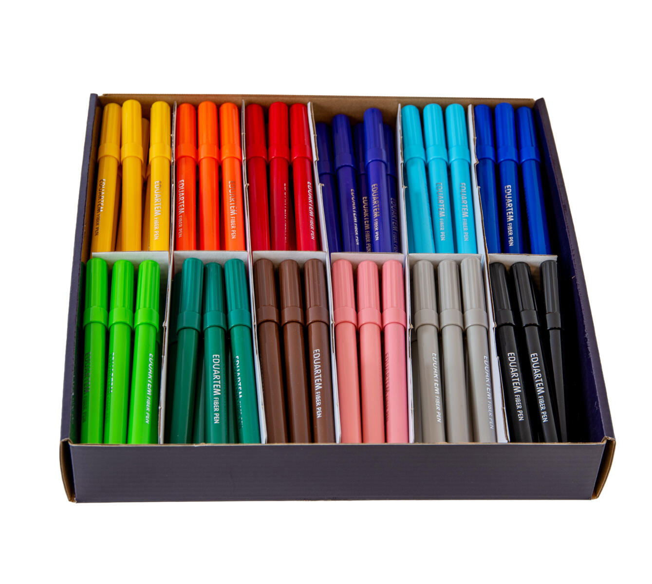 144 stk/pk. Tusjer av god kvalitet. Med slitesterk spiss og ventilert hette. Vannbasert farge som kan vaskes av fra tekstiler på maskinvask 40°C. Inneholder 12 stk av hver farge; gul, oransje, rød, lyseblå, blå, lilla, lysegrønn, grønn, brun, rosa, grå og svart. Lengde 150 mm. Diameter 13 mm. Spiss Ø2,8 mm. Fra 3 år. PVC-fri.