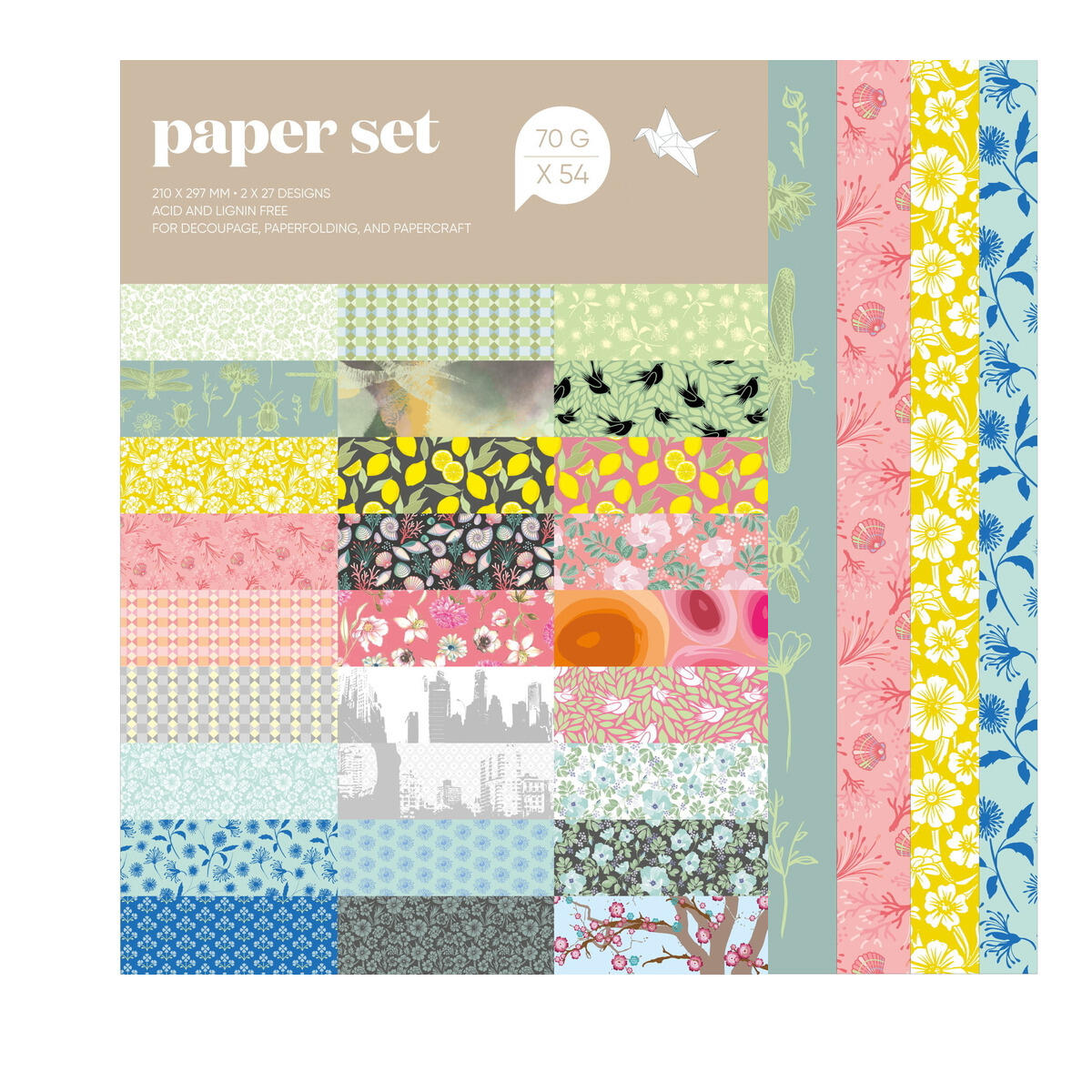 54 ark dekorpapir i A4-størrelse med en vekt på 70 g/m². Et herlig utvalg av mønstre med blomster og dekorative figurer i myke og glade farger. Papirene er ensidige, noe som gjør dem ideelle til å lage egne kort, brette origami, dekorere gaveinnpakninger eller bruke i scrapbooking-prosjekter. 27 ulike design i hvert blokk, 2 ark av hver. Syre- og ligninfritt. Mål: 210 × 297 mm.