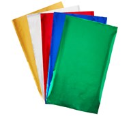 12 ark/pk. 280 g. 2 ark av hver farge: rød, blå, grønn, svart, gull og sølv. Hvit bakside. Mål: 25x35 cm.
