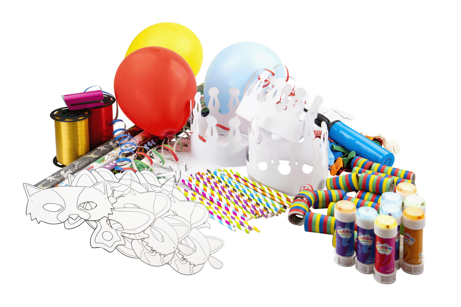 20 deler. I dette settet får du alt du trenger for å feire. Inneholder 77960 ballongpunpe, 129713 ballonger, 11209 serpentiner, 139077 kroner, 139090 papirmasker dyr 16 stk, 3 x 46891 gavepapir, 77592-98 gavebånd gull, 77592-12 gavebånd rødt, 29010 sugerør, 47594 båndstrimler og 8 x 110197 såpebobler.