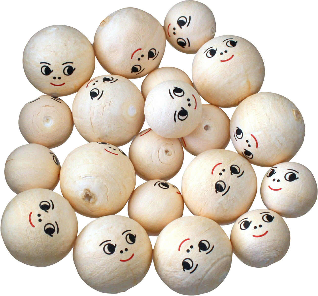 20 stk/pk. Trekuler med ferdigmalte ansikt. Ø3 cm. Av ubehandlet tre.