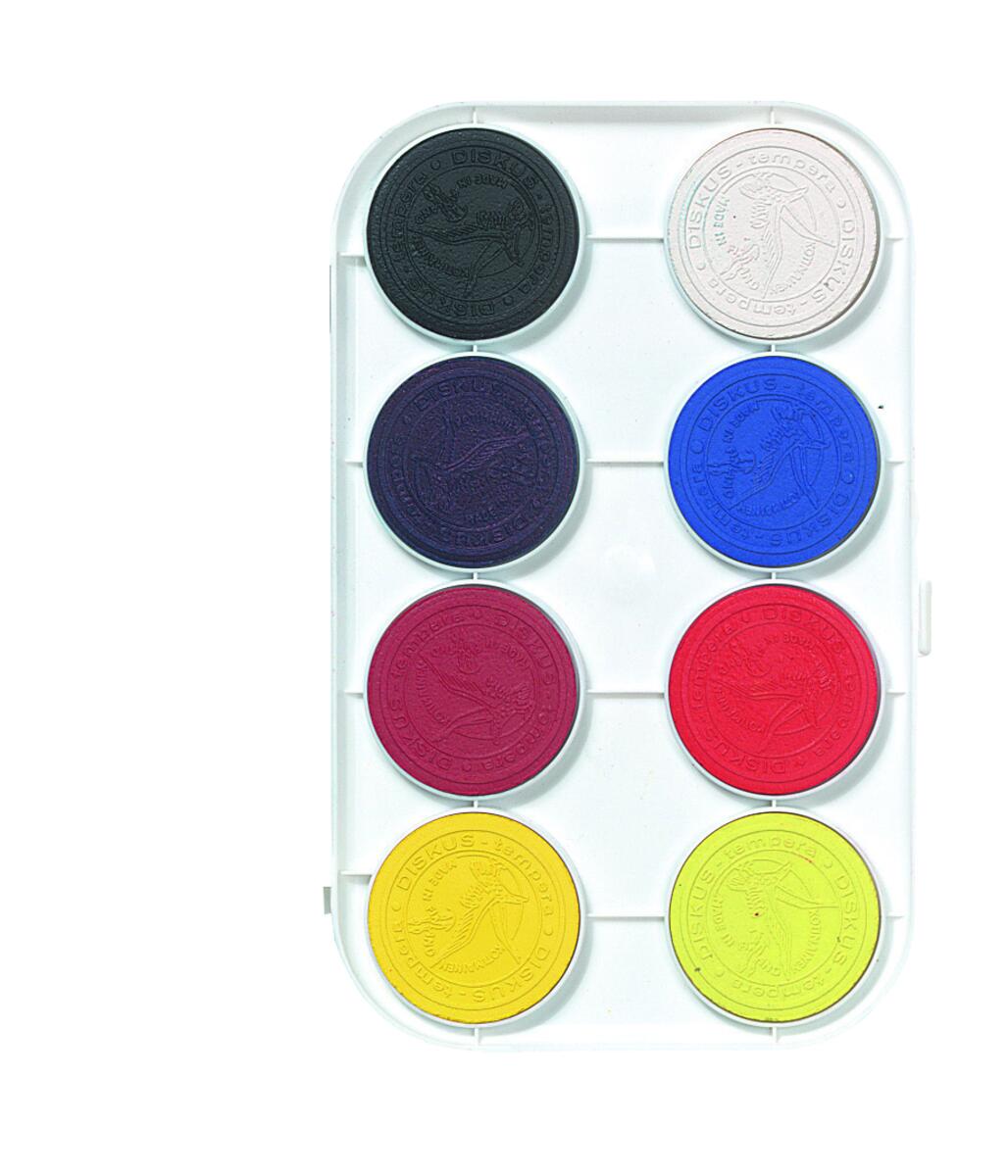 Transparent maling. Palett med 8 fargeblokker Ø42 mm, 5 mm tykk.