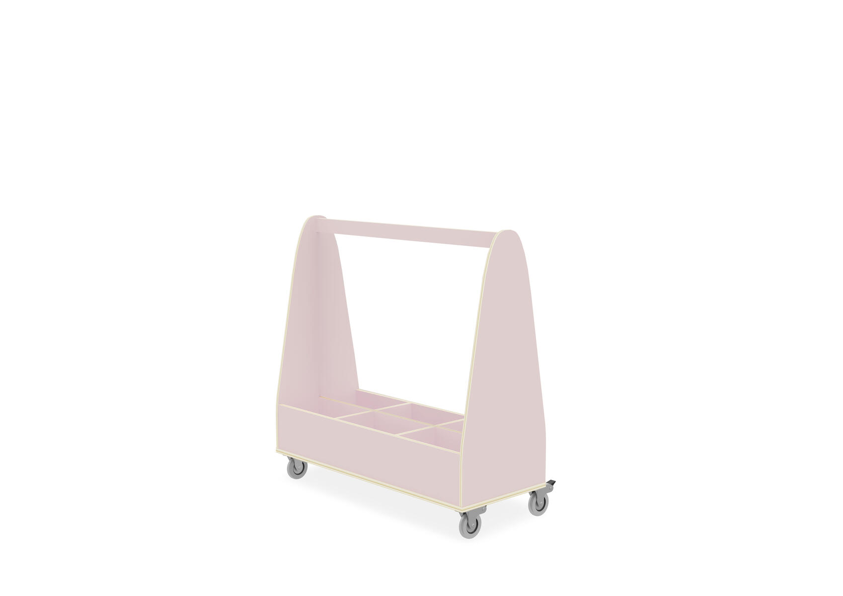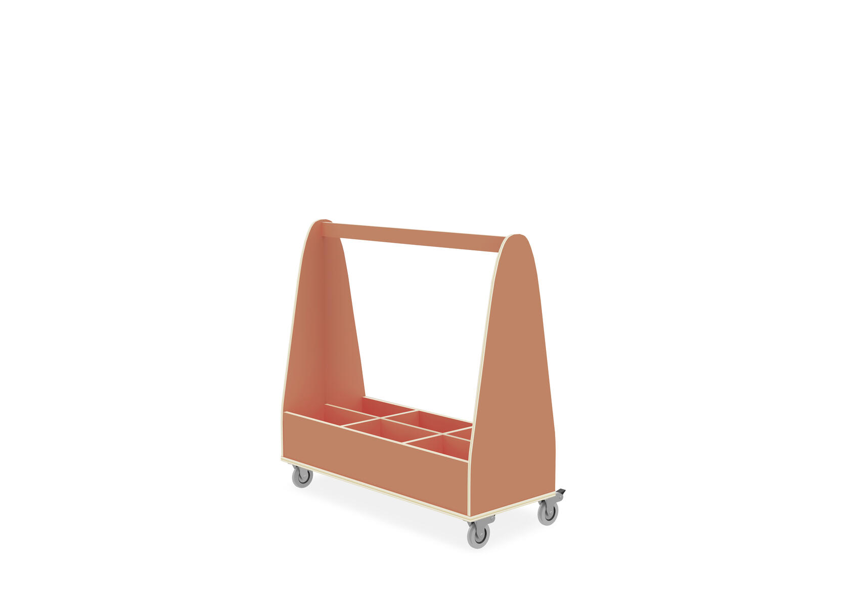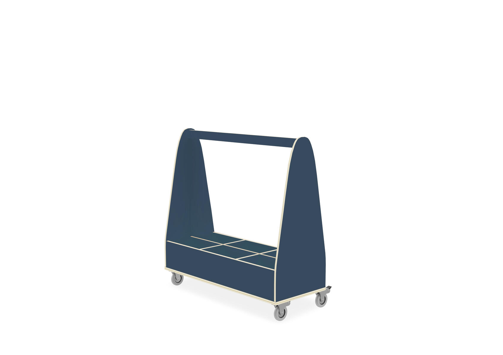 Staffeli med små oppbevaringsrom. Ferdig modul. Laget i bjørk kryssfiner, farger med HT har høytrykklaminat, 16 mm. Bjørk og hvitpigmentert er i 18 mm kryssfiner. Plexiplate deler staffeliet slik at det kan brukes på begge sider. Hjul med lås monteres av kunde. 2 faste og 2 bevegelige hjul. Mål: B88 D36 H89 cm.